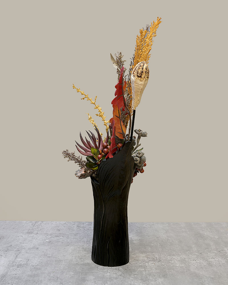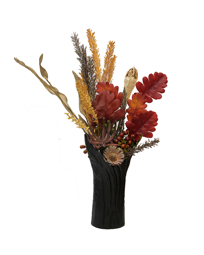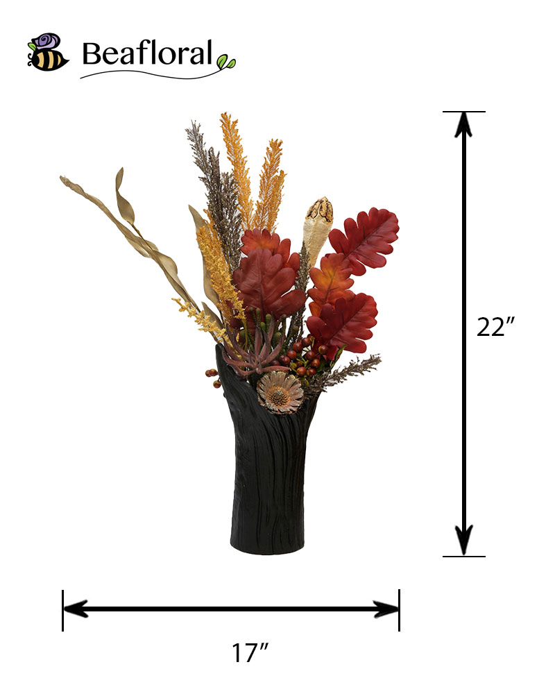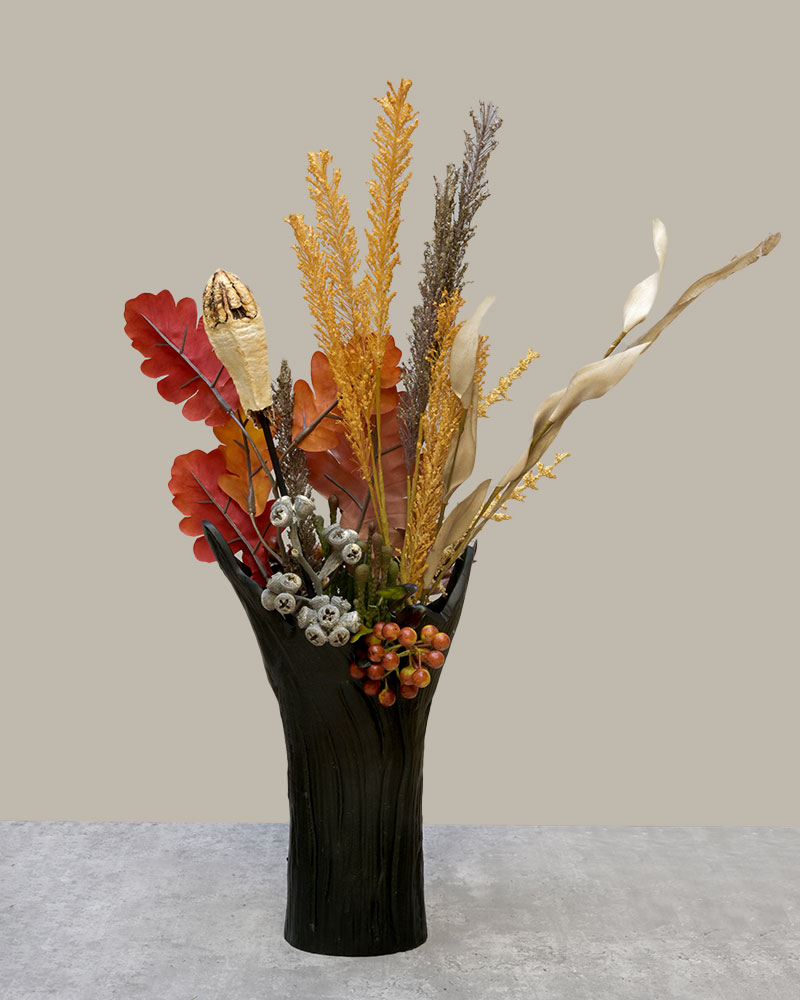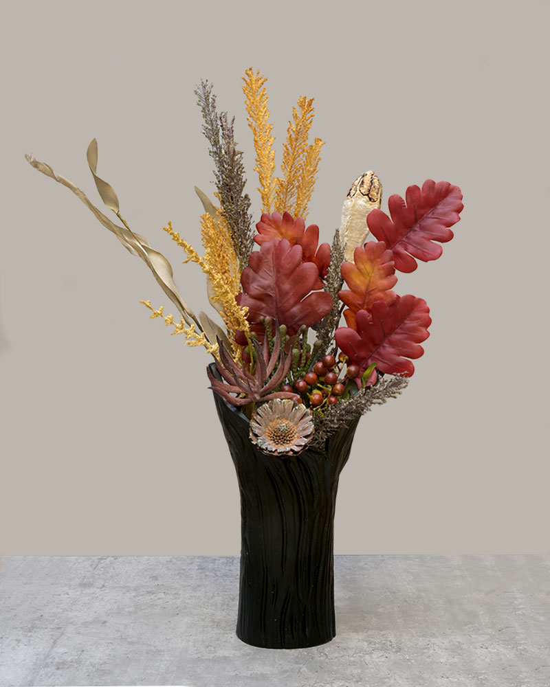 This striking arrangement captures the essence of autumn with its rich seasonal tones and bold textures. Deep red oak-inspired leaves pair beautifully with golden sprigs, natural seed pods, and clusters of berries, creating a warm and inviting display. Accents of dried florals and greenery add depth and contrast, while the tall black vase with its subtle woodgrain finish provides a modern yet earthy foundation. Perfect for adding a touch of seasonal charm to a dining table, entryway, or living space, this arrangement offers a sophisticated way to celebrate the beauty of fall.