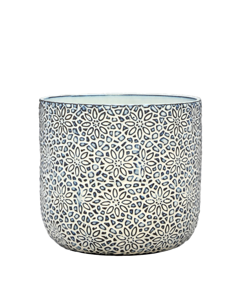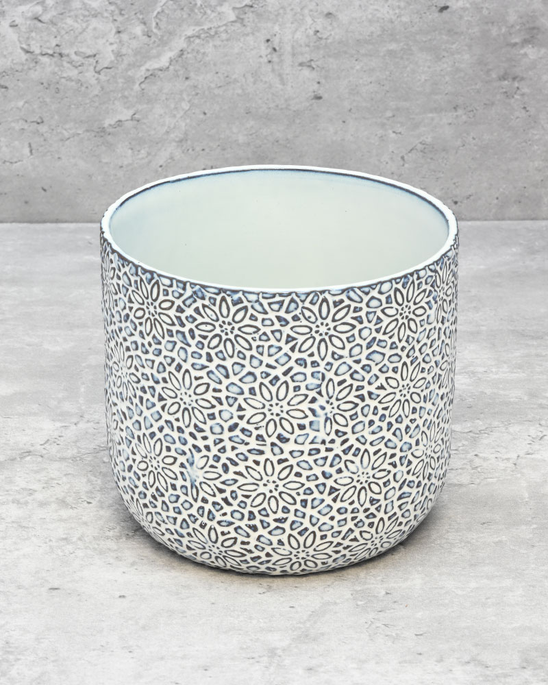 This container showcases a beautifully textured mosaic pattern in blue and white floral motifs, offering a delicate yet eye-catching design. Ideal for smaller arrangements, it brings a charming blend of classic and artistic style to any space. Perfect for adding a subtle pop of colour and texture to shelves, desks, or windowsills, this container is as decorative as it is functional.