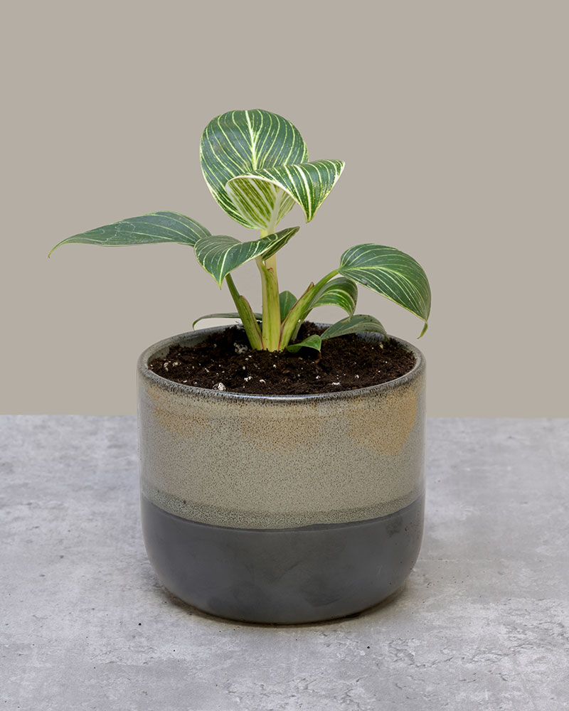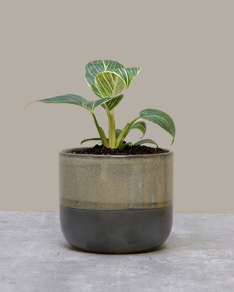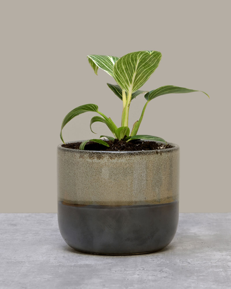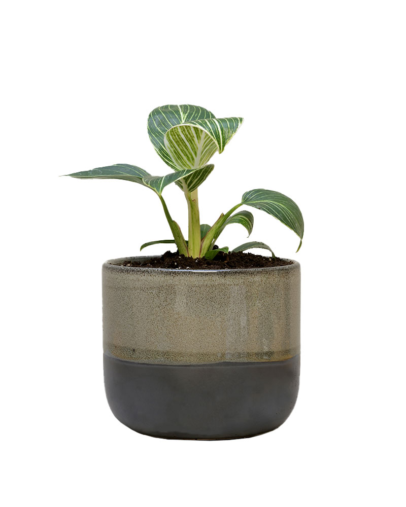 Elegant, lush, and timeless, Naturally Rooted showcases the quiet beauty of foliage through simplicity and form. Broad, glossy leaves marked with delicate white veins rise gracefully from a smooth, two-tone ceramic planter that blends warm beige and charcoal grey. The result is a refined piece that brings natural balance and calm to any space. Perfect for bright interiors, desks, and living spaces, this design adds a fresh yet grounded touch to modern décor.