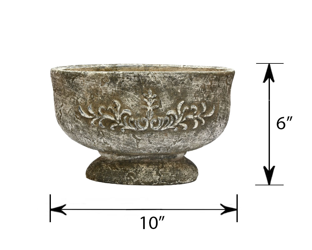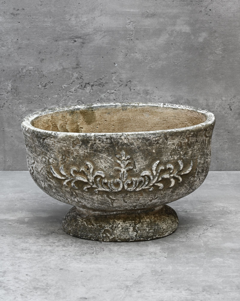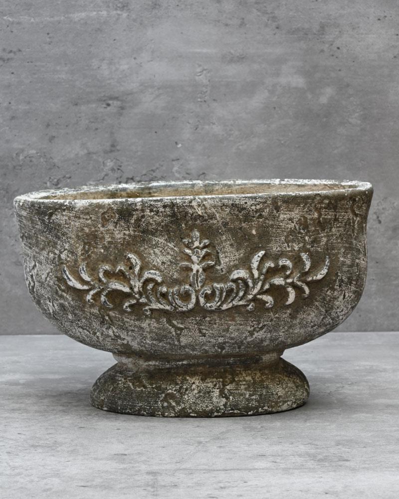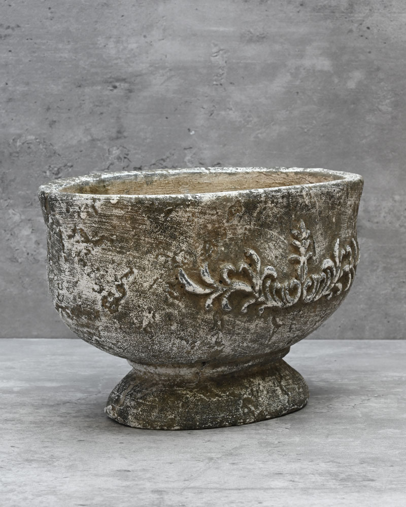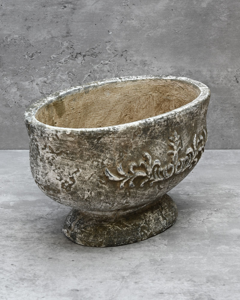 This oval pedestal planter offers a beautifully rustic look and feel. Crafted from cement with an aged patina finish, it evokes the charm of a relic from a bygone era. Perfect for adding a touch of timeless character to any arrangement, it’s an ideal choice for achieving an ancient, weathered aesthetic.