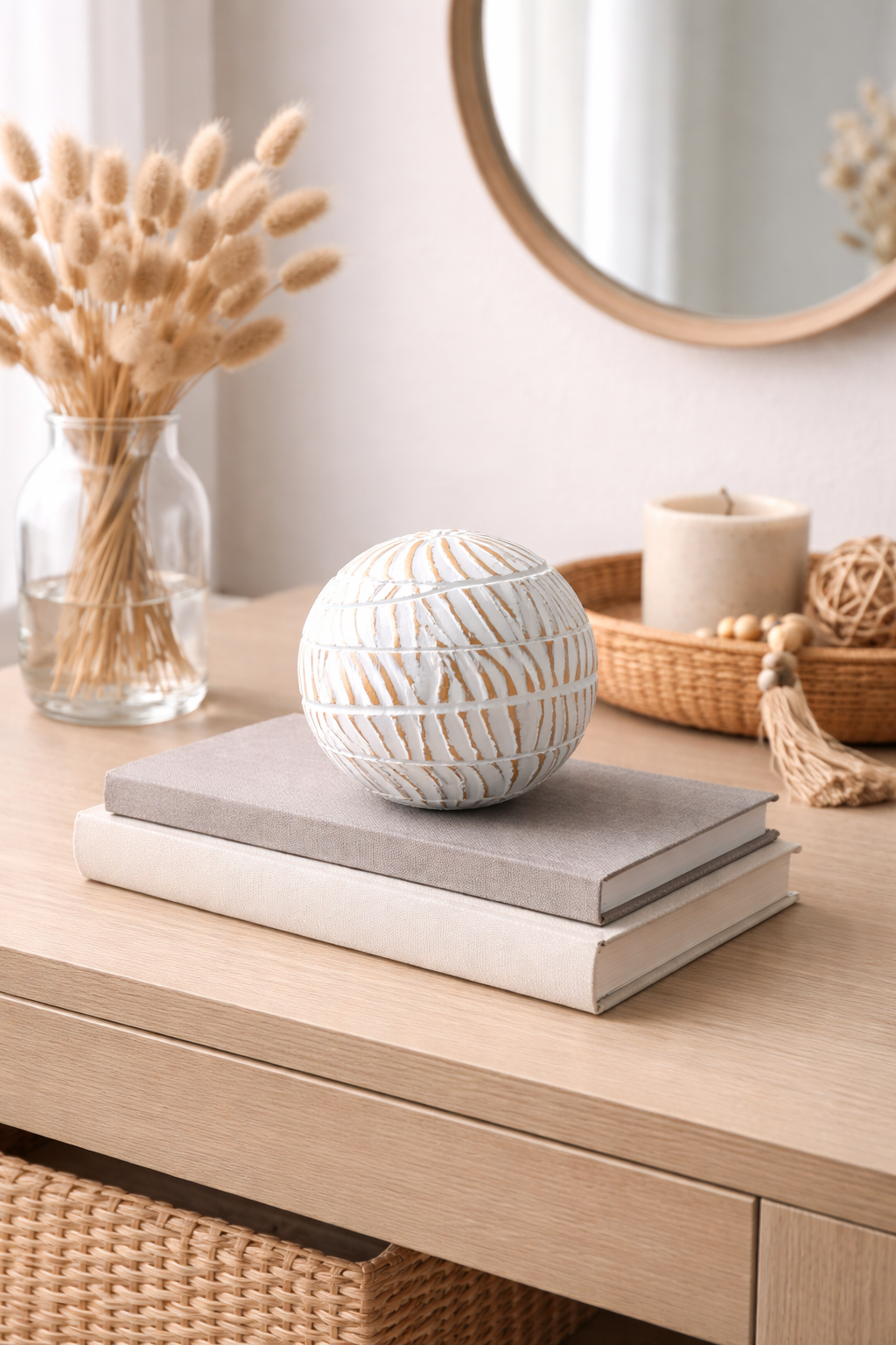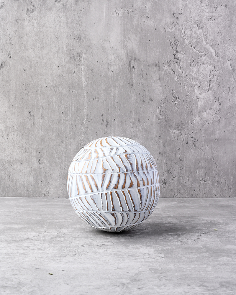 This decorative ball features an intricate overlapping design with a beautifully whitewashed, textured finish, making it a standout accent piece for any room. Perfect on its own or when grouped together, multiple pieces can elegantly fill a bowl or tray. Combine them with other decorative accents to create a captivating and cohesive display that adds depth and a subtle coastal charm to your space.
