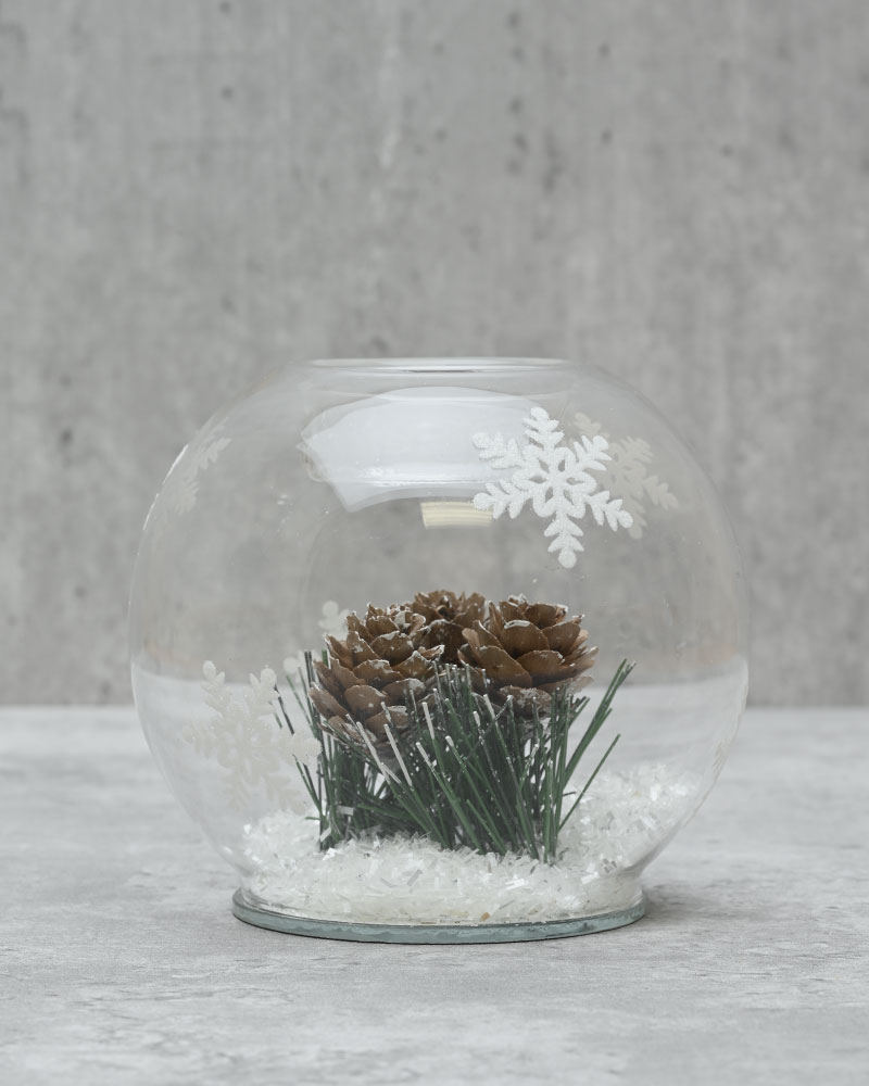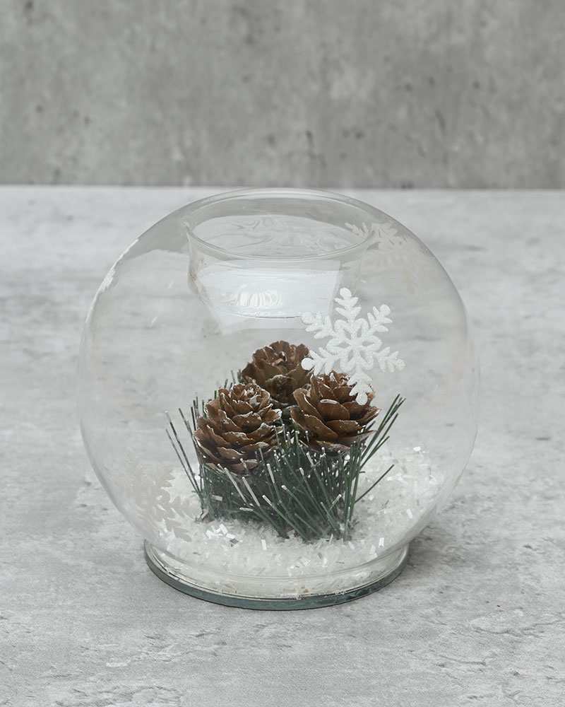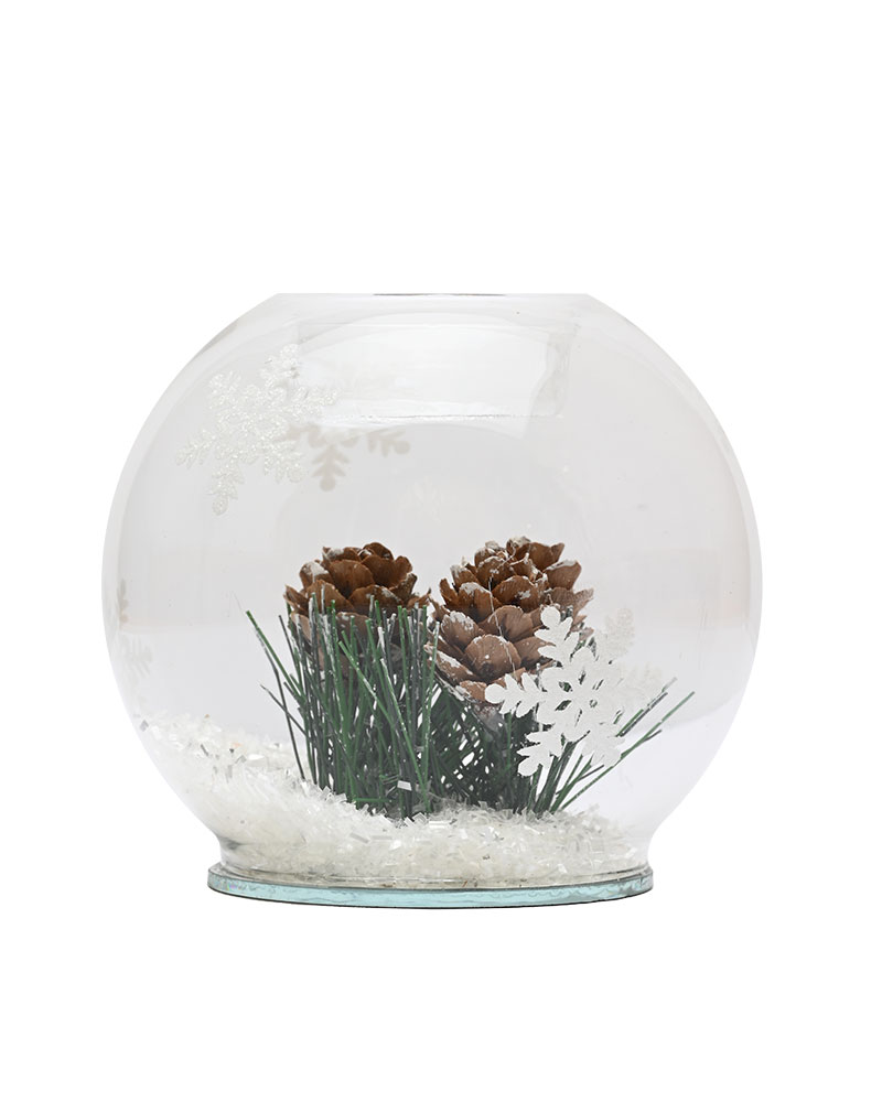 This elegant glass votive holder captures the quiet beauty of winter with frosted pinecones nestled among evergreen sprigs, all set atop a bed of shimmering faux snow. Etched snowflakes decorate the outside of the globe, creating a soft, wintry glow when a tealight is lit. A cozy and natural accent perfect for holiday decorating, table settings, or gifting.
