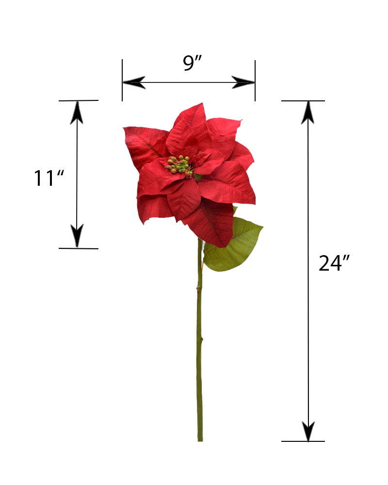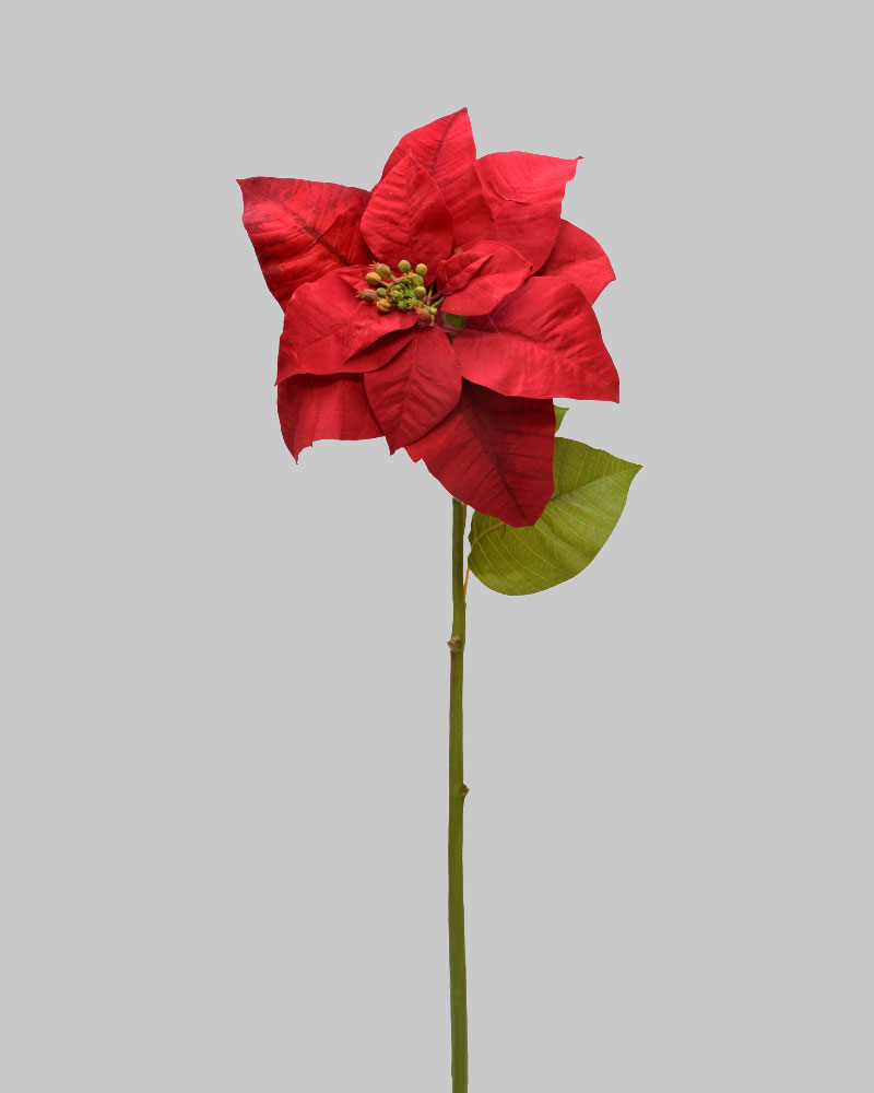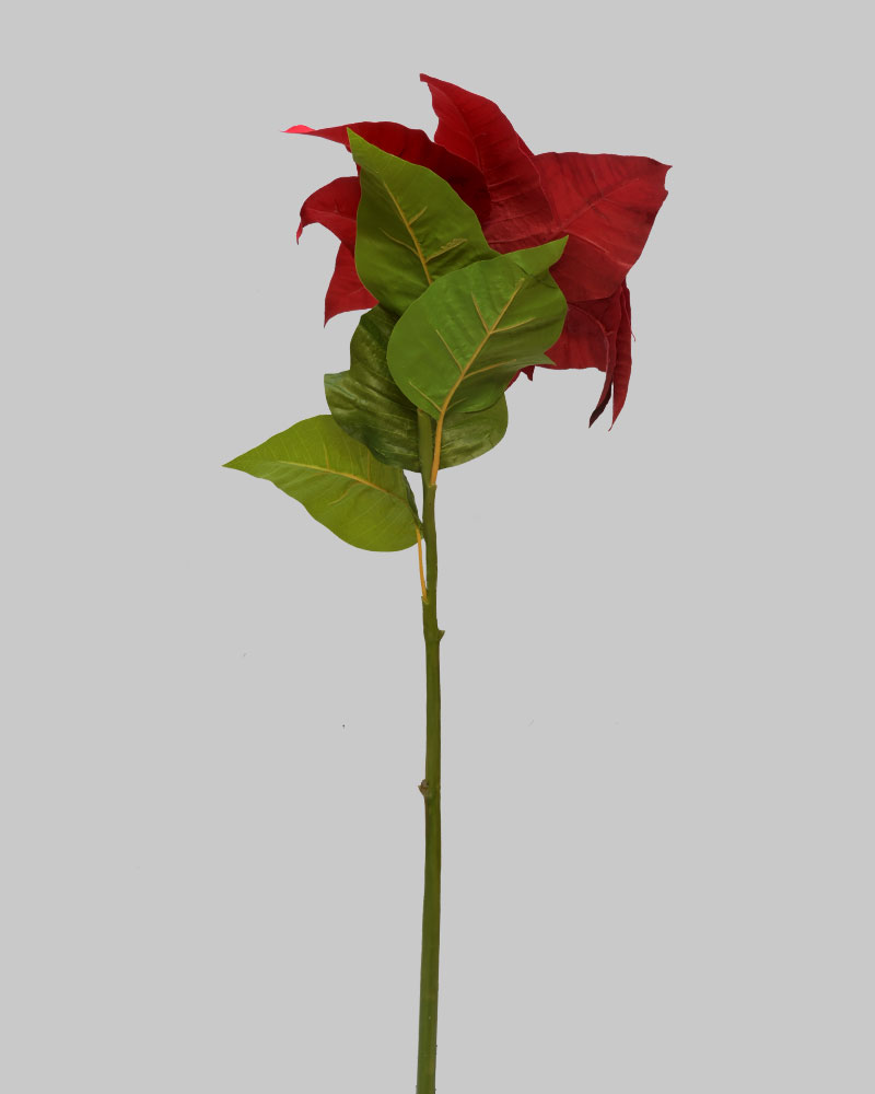 This classic red poinsettia stem captures the timeless beauty of the holiday season. Its velvety petals and lush green leaves create a rich, festive contrast that instantly brightens any arrangement. The realistic texture and deep red hue make it perfect for Christmas centrepieces, wreaths, or decorative displays. Whether used on its own or paired with greenery and metallic accents, this poinsettia adds warmth, tradition, and elegance to your seasonal décor.