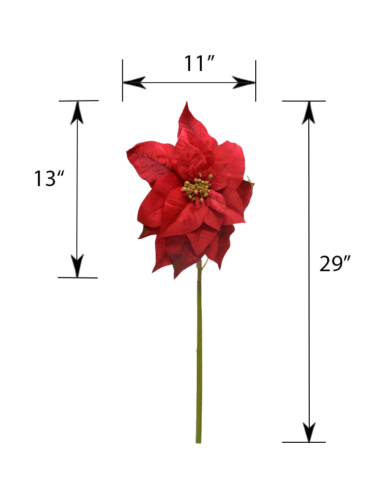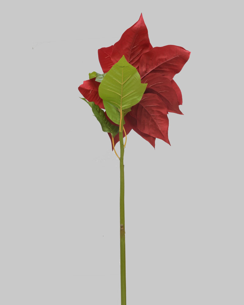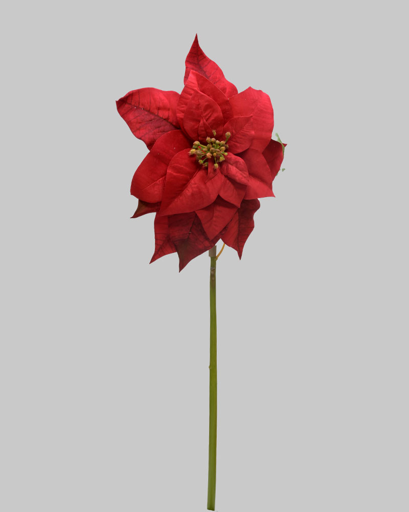 This classic red poinsettia stem captures the timeless beauty of the holiday season. Its velvety petals and lush green leaves create a rich, festive contrast that instantly brightens any arrangement. The realistic texture and deep red hue make it perfect for Christmas centrepieces, wreaths, or decorative displays. Whether used on its own or paired with greenery and metallic accents, this poinsettia adds warmth, tradition, and elegance to your seasonal décor.