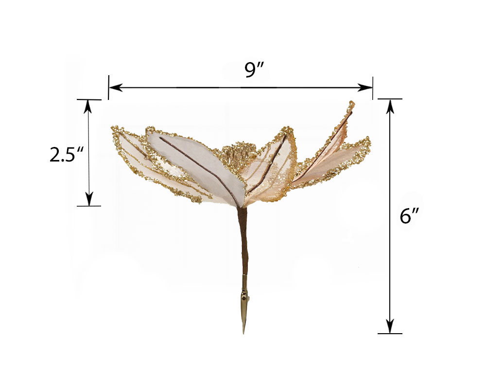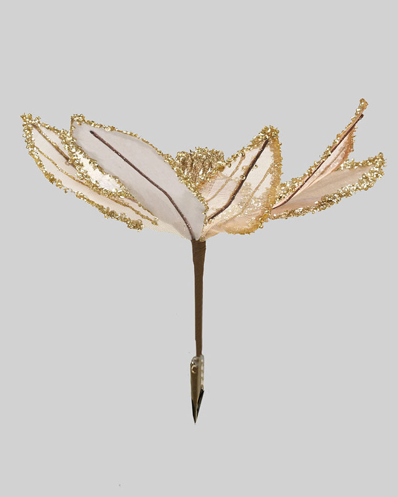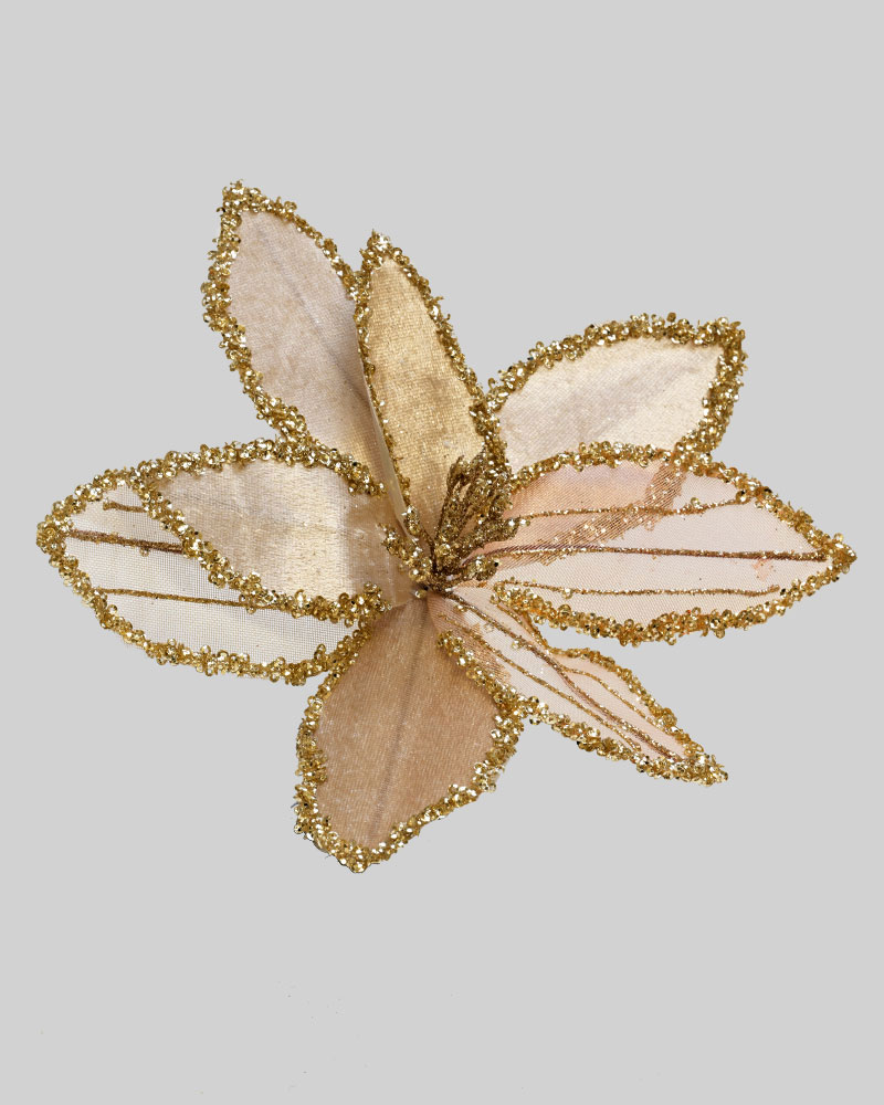 This elegant poinsettia clip adds a touch of luxury and sparkle to your holiday décor. Its soft champagne-gold petals shimmer with a delicate sheen, beautifully outlined in fine golden beading for extra festive radiance. The wired petals allow for shaping and versatility, making it perfect for adorning Christmas trees, wreaths, garlands, or floral arrangements. Sophisticated and eye-catching, this poinsettia brings a refined holiday elegance to any seasonal display.