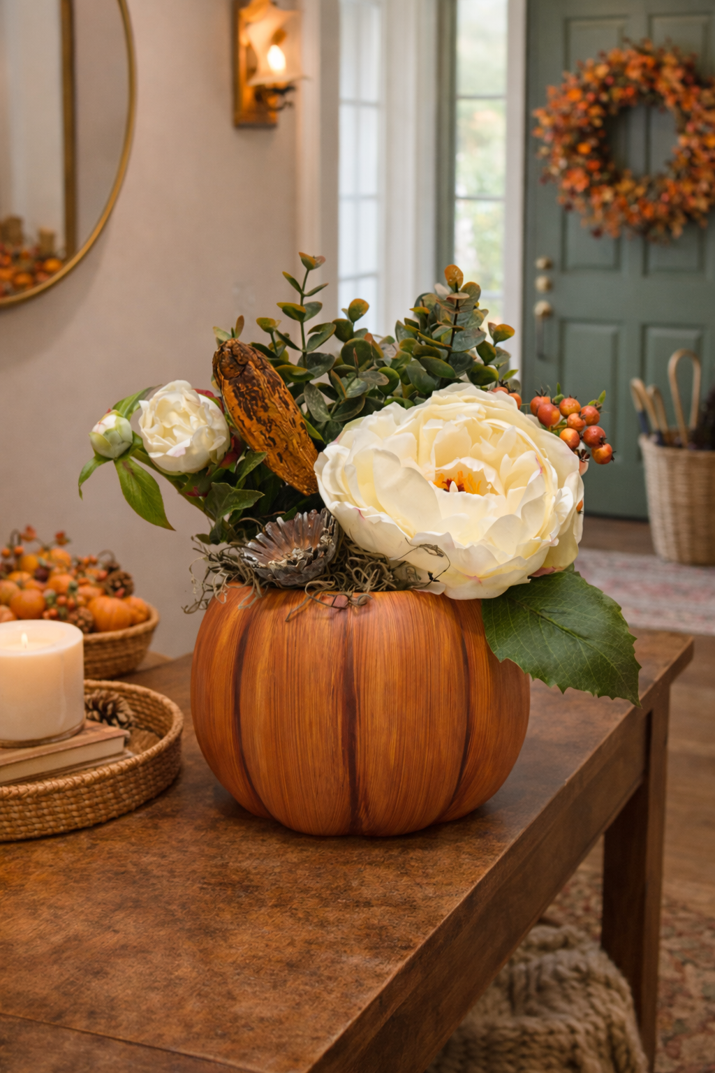 Bring the warmth of the harvest season into your home with this elegant artificial arrangement. Designed in a glazed ceramic pumpkin container with natural orange tones, it features lifelike cream peonies, faux berries, rich greenery, a rustic gourd accent, and a dried natural flower for a touch of earthy texture. Perfect for Thanksgiving or autumn décor, this piece adds a cozy, seasonal charm to any space.