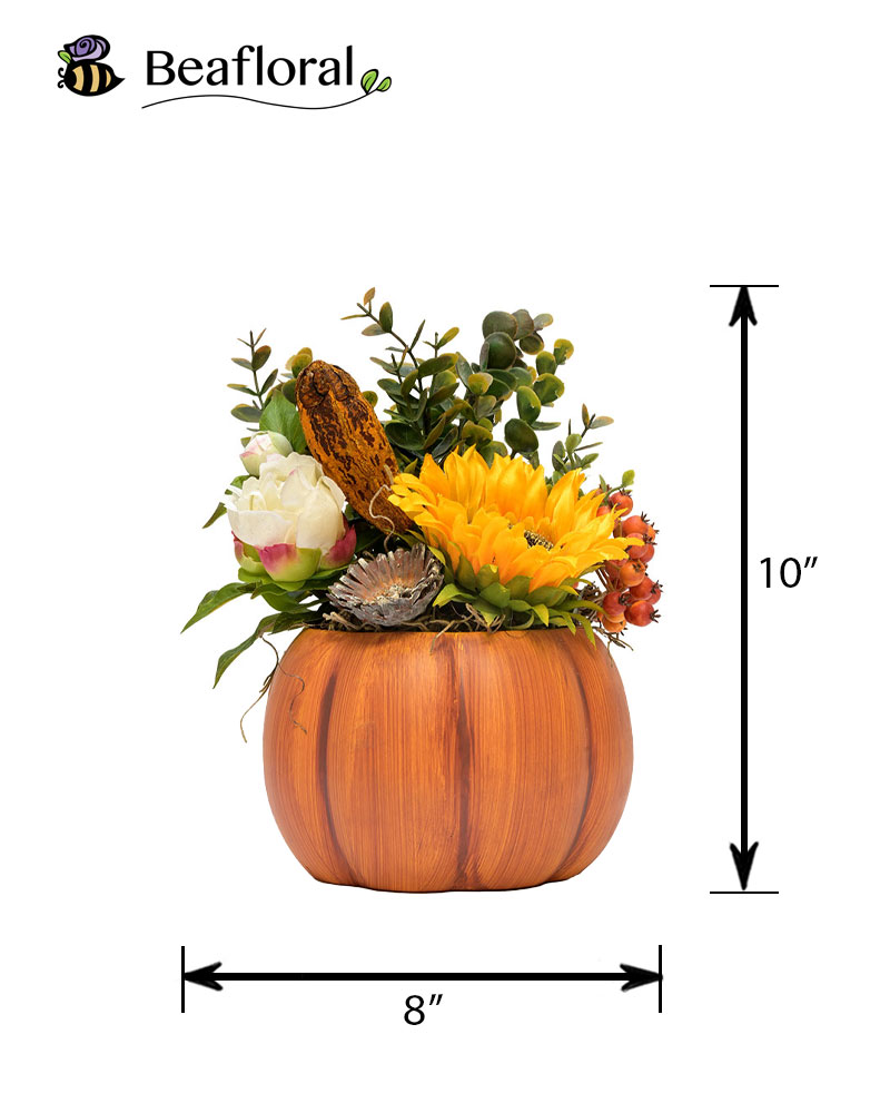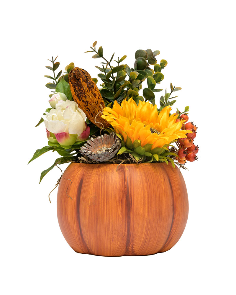 Bring the warmth of the harvest season into your home with this elegant artificial arrangement. Designed in a glazed ceramic pumpkin container with natural orange tones, it features a bright yellow sunflower, faux berries, rich greenery, a rustic gourd accent, and a dried natural flower for a touch of earthy texture. Perfect for Thanksgiving or autumn décor, this piece adds a cozy, seasonal charm to any space.