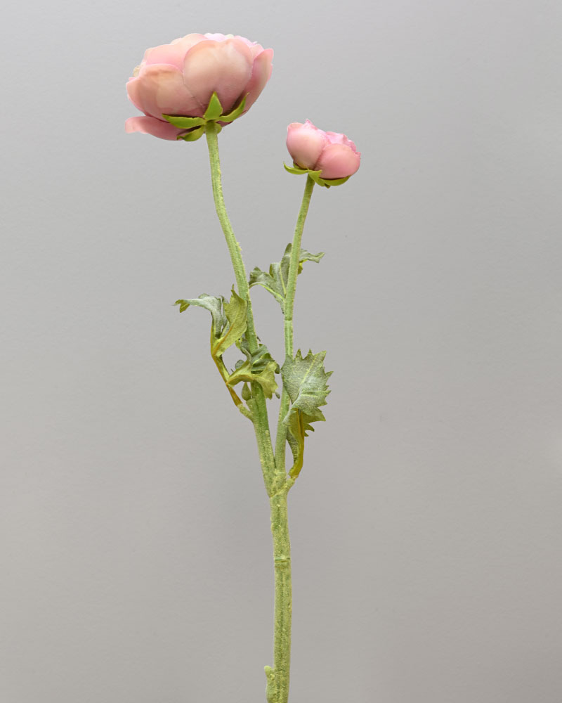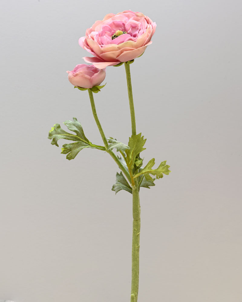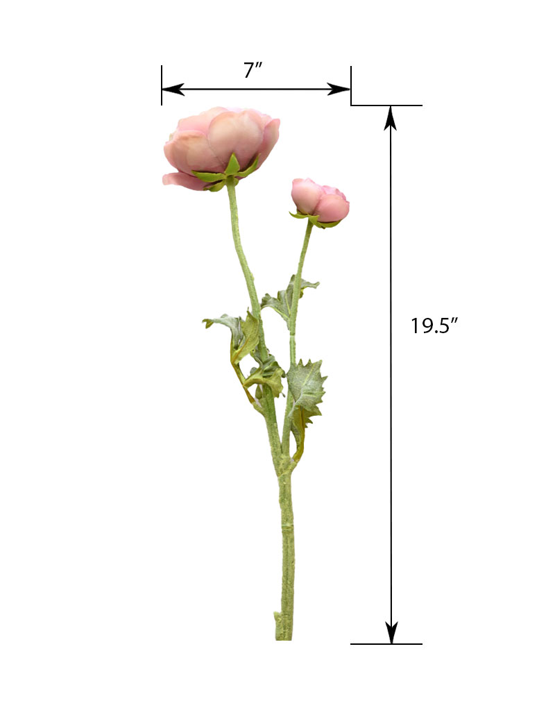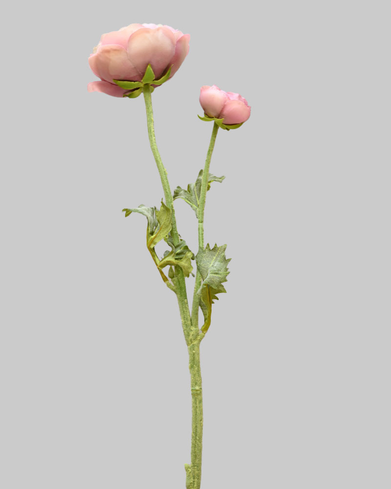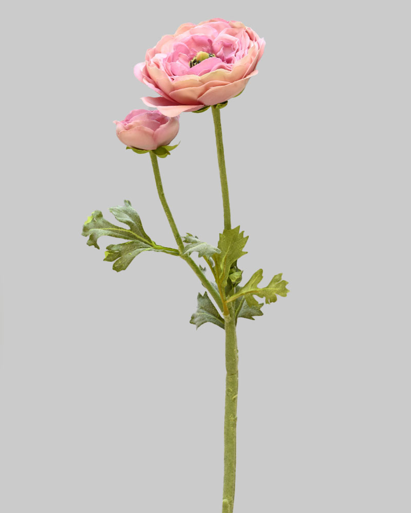 The Ranunculus is one of nature’s most stunning flowers. Layers of delicate petals come together to form a truly remarkable bloom. This stem features a large open flower in deep lavender, paired with a smaller budding bloom and subtle natural touches that enhance its lifelike beauty. A true standout, it brings rich colour and graceful elegance to any arrangement.
