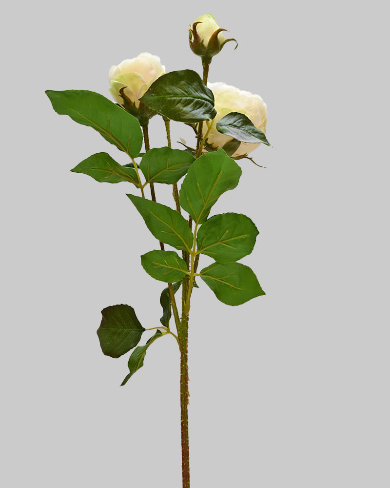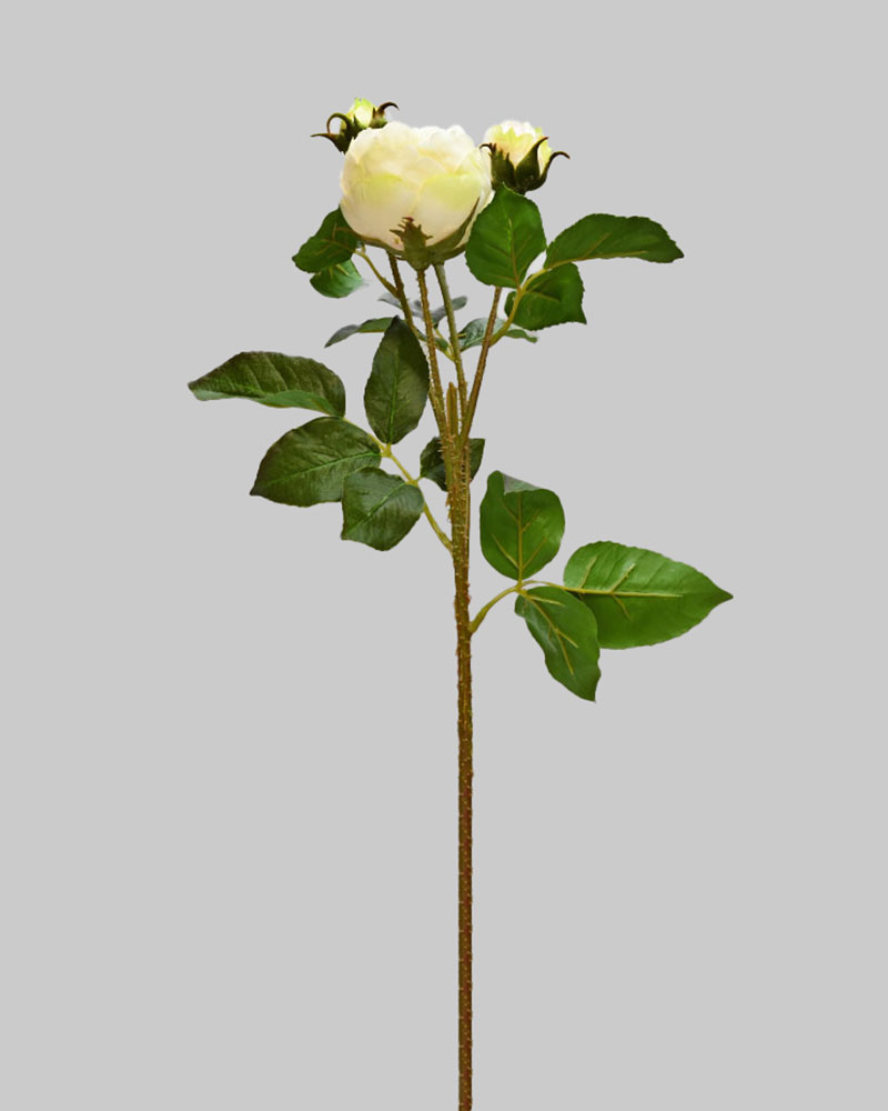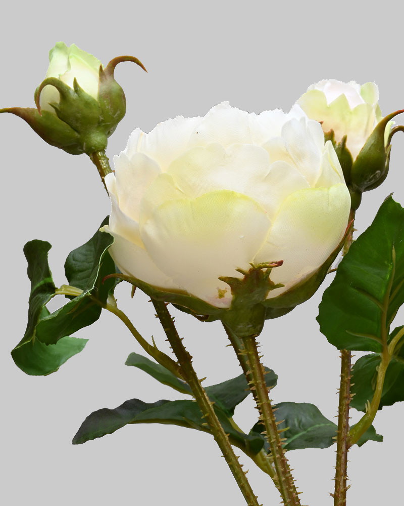 This rose spray, in a soft cream colour, makes a lovely, full-bodied accent for any arrangement. The attention to detail—even including thorny stems—beautifully captures the traditional rose look.