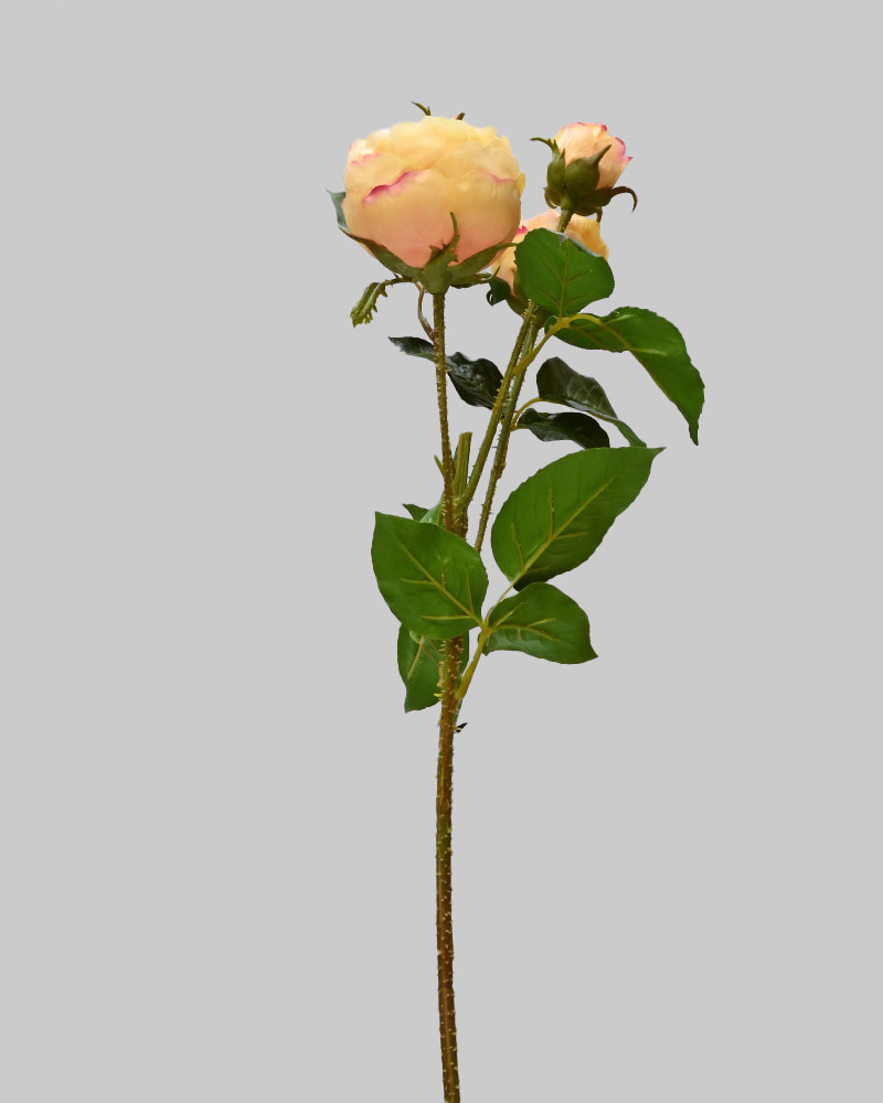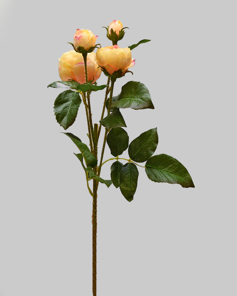 This rose spray, in a warm yellow colour with delicate pink edges, makes a lovely, full-bodied accent for any arrangement. The attention to detail—even including thorny stems—beautifully captures the traditional rose look.