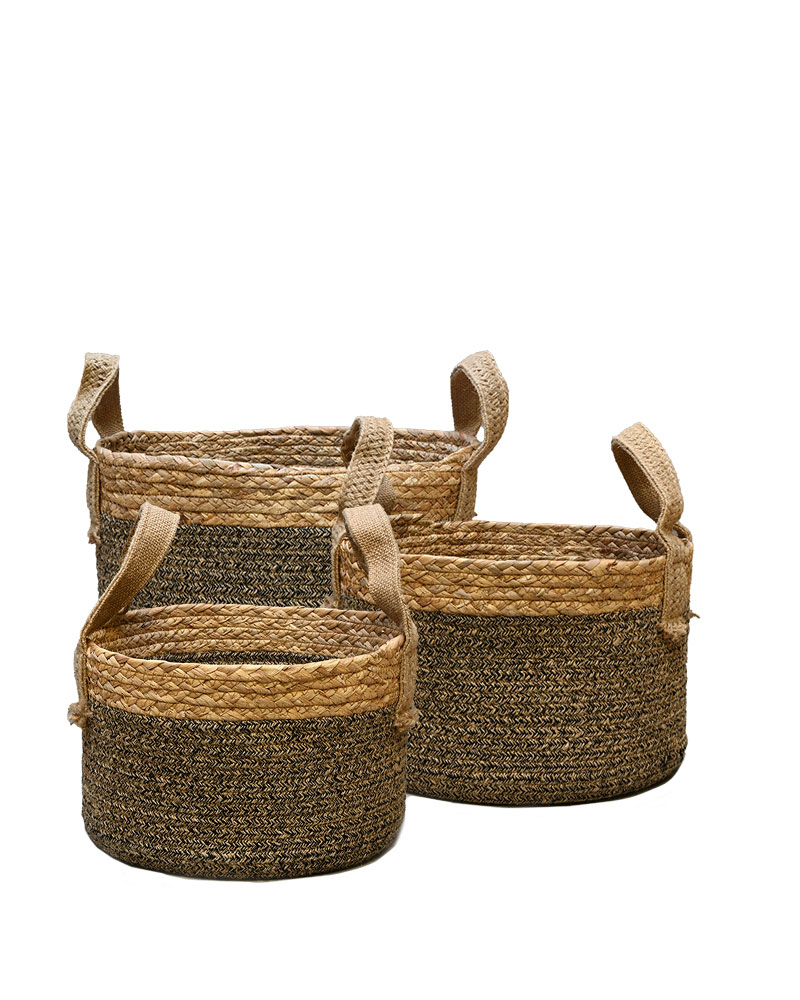These beautifully hand-woven baskets, crafted from natural fibres, offer both function and charm—perfect for enhancing your home’s storage solutions. Each basket features a sturdy structure with a soft, organic texture, complemented by a stylish two-tone colour design that adds a warm, earthy feel to any space. Ideal for organizing towels in the bathroom, storing household essentials in the living room, or even displaying artificial arrangements with a rustic touch. Sold as a set of three in varying sizes, they nest neatly when not in use, combining practicality with timeless style.