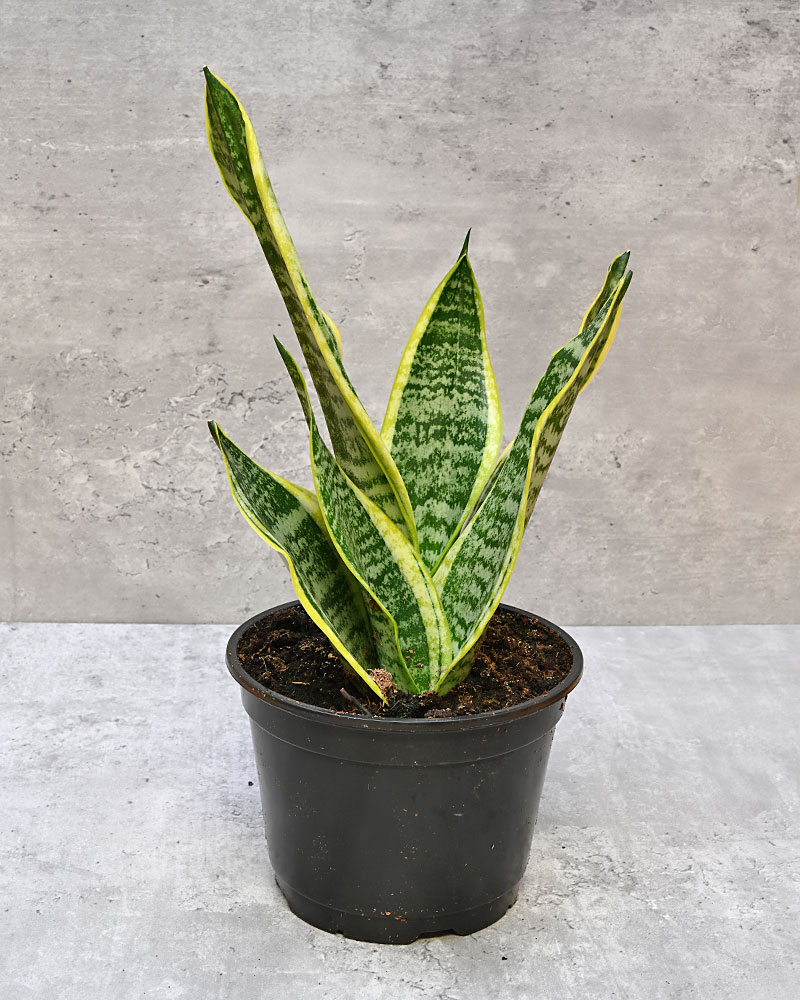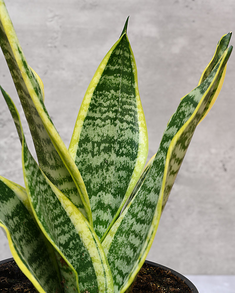 Sansevieria Laurentii, commonly known as the snake plant, is a hardy succulent native to Africa. With its tall, upright, sword-like leaves edged in yellow, it makes a striking and easy-care addition to any indoor space.