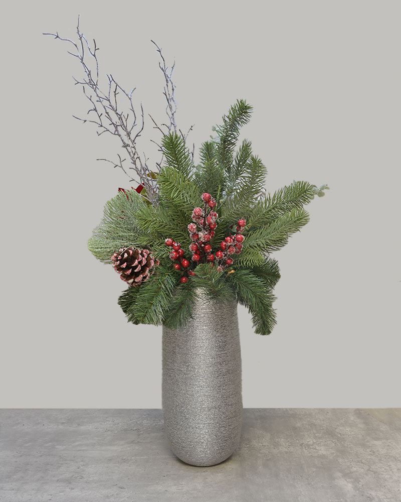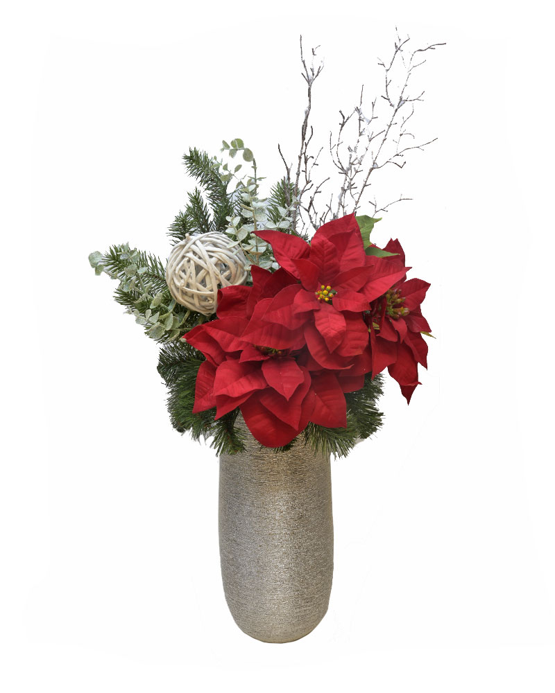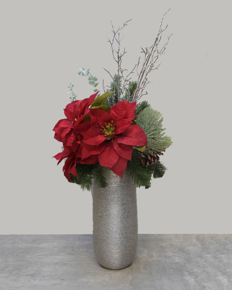 Silver Frost Poinsettia brings a refined touch of holiday elegance to any space. Bold scarlet poinsettias take centre stage, complemented by frosted evergreens, winter branches, and a textured rattan-style ornament that adds depth and interest. The arrangement is presented in a tall, shimmering silver vase that enhances its sophisticated, modern look. With its rich colours and graceful winter textures, Silver Frost Poinsettia is ideal for entryways, dining tables, office settings, or as a thoughtful seasonal gift. It adds a polished and festive statement wherever it's displayed.