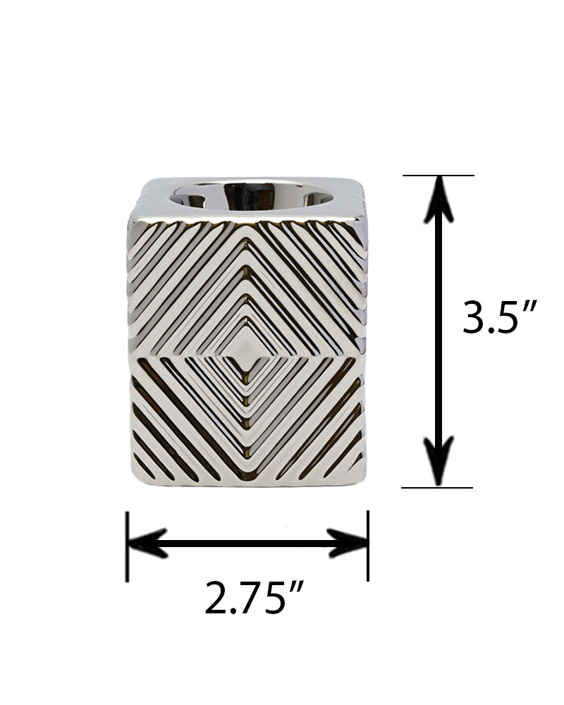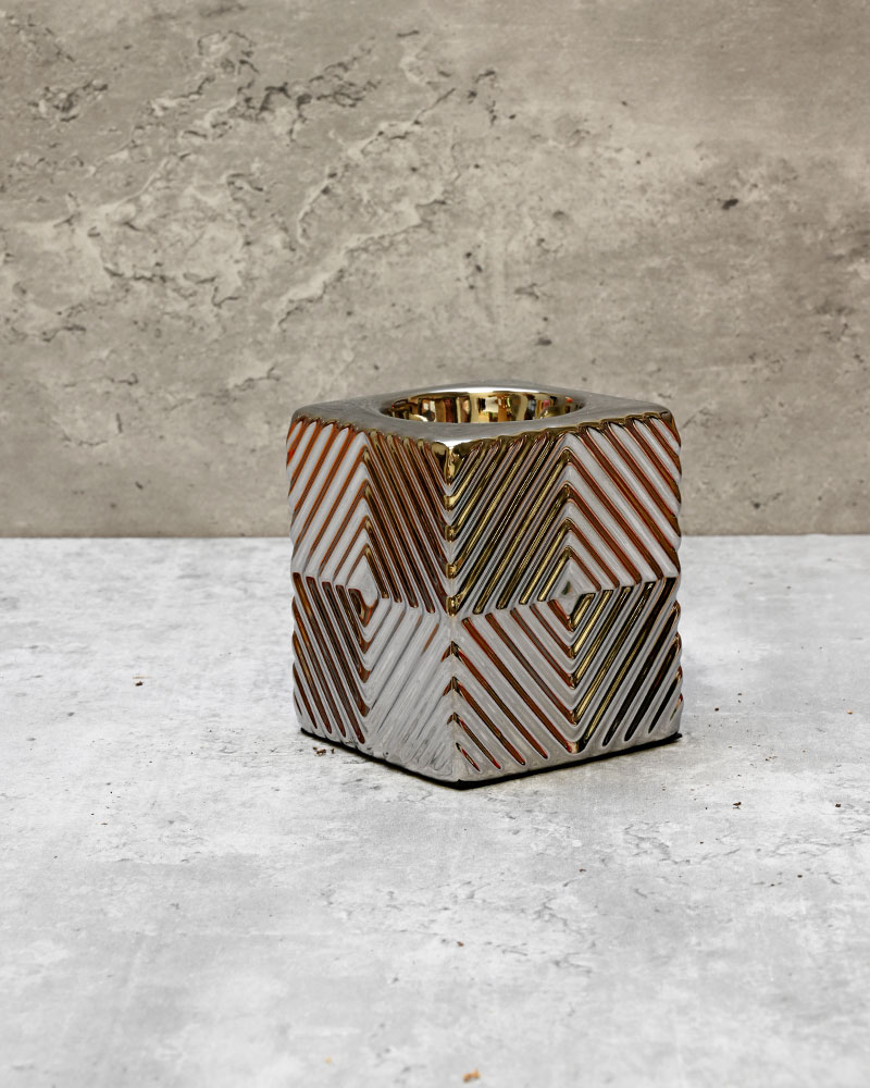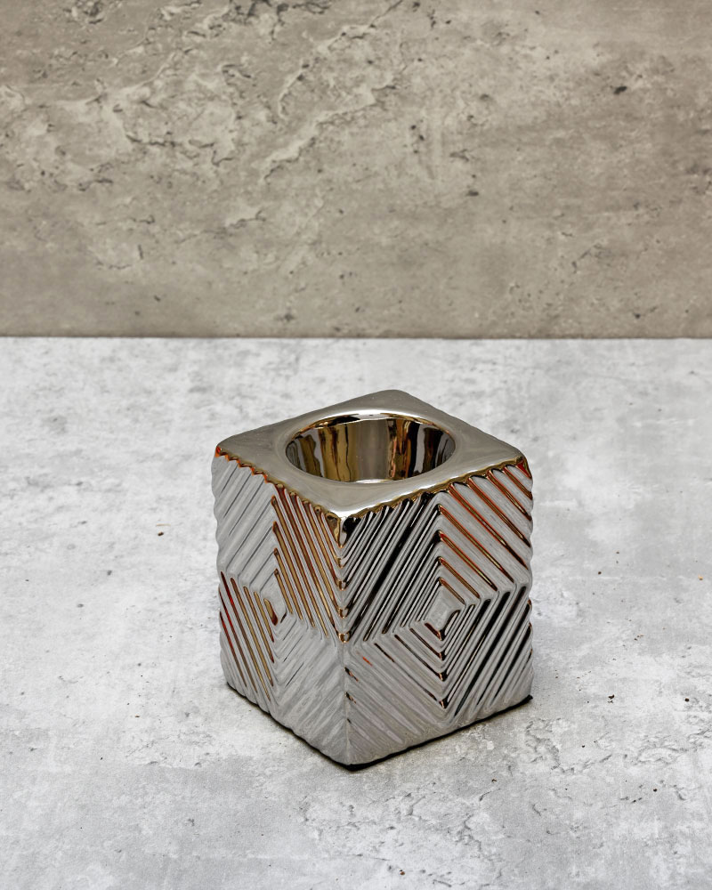This ceramic cube tealight holder features a linear etched exterior, offering a timeless and classic look that complements any table, mantel, or shelf. Its clean lines and subtle texture bring a sense of understated elegance to your décor. Pair it with other pieces from the same series to create a dramatic and cohesive display that’s both stylish and aesthetically pleasing.