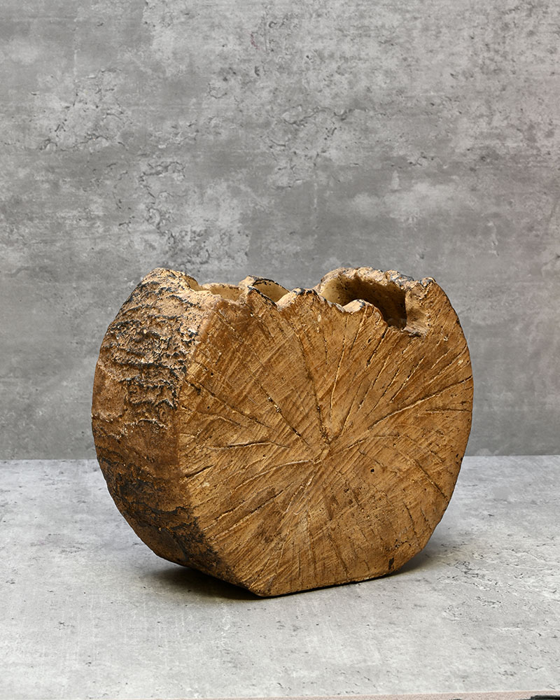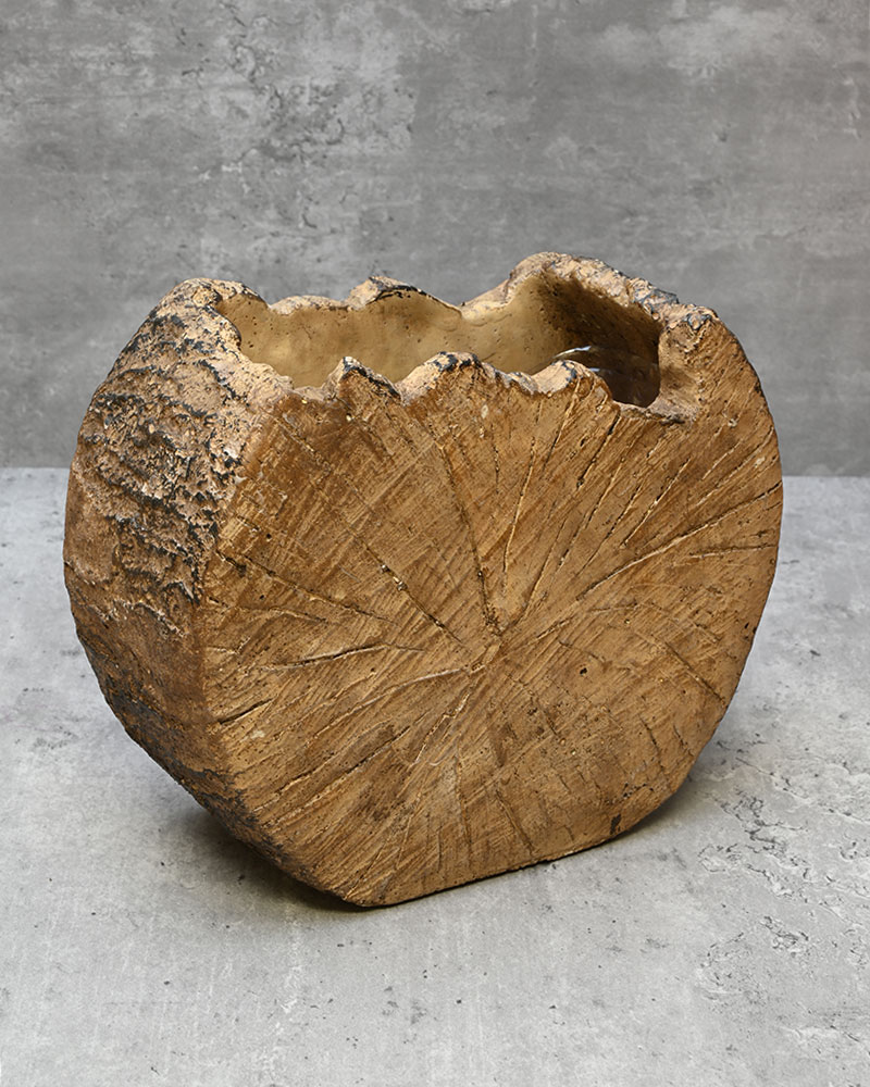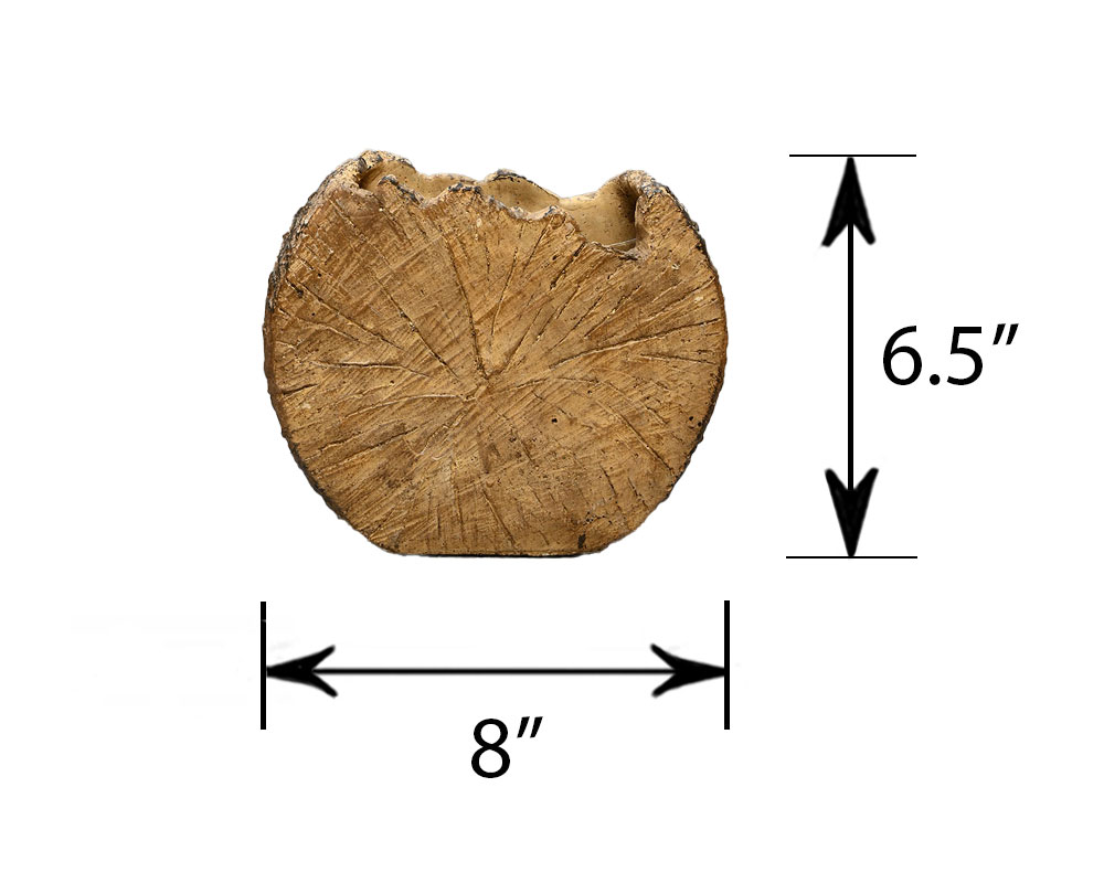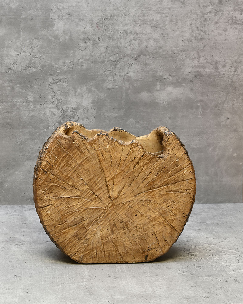 A unique and eye-catching container, this piece perfectly imitates a tree trunk with its rich brown tone and detailed outer bark finish — a true standout in any setting.