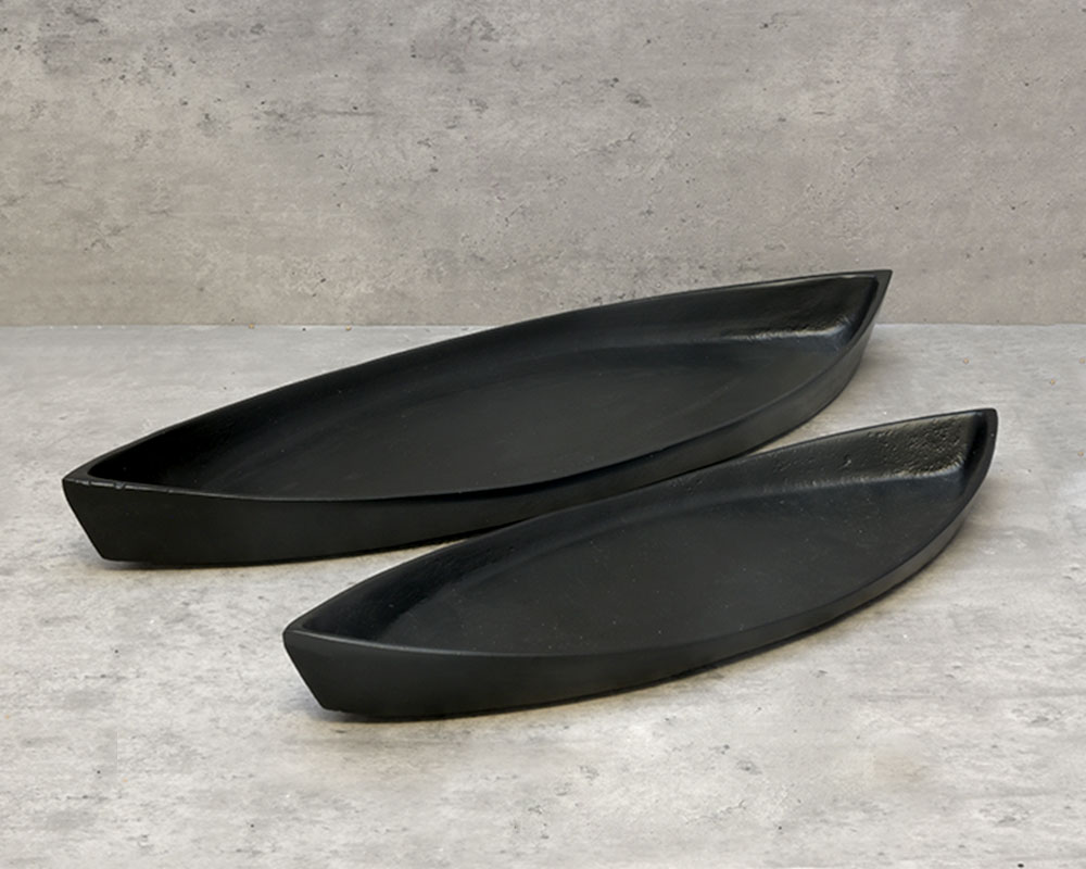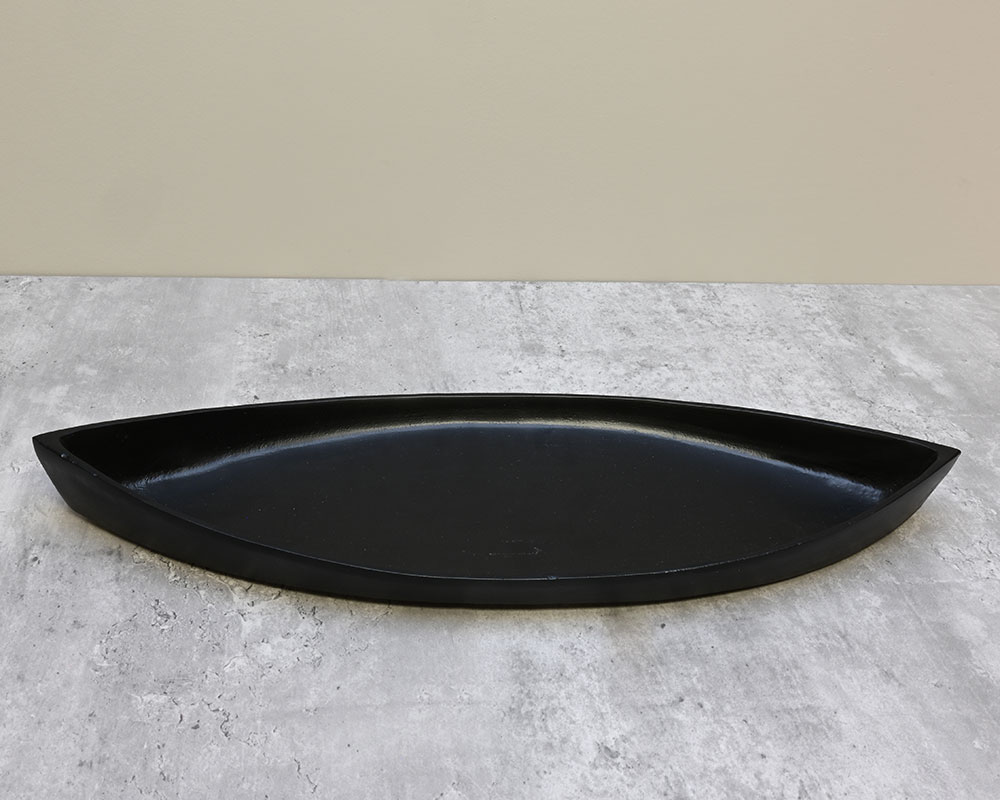 Rustic yet elegant, this low-profile, canoe-shaped platter brings a unique charm to any table, shelf, or mantle. Its distinctive shape makes it a perfect base for decorative accents, helping to create a striking and stylish display in any room.