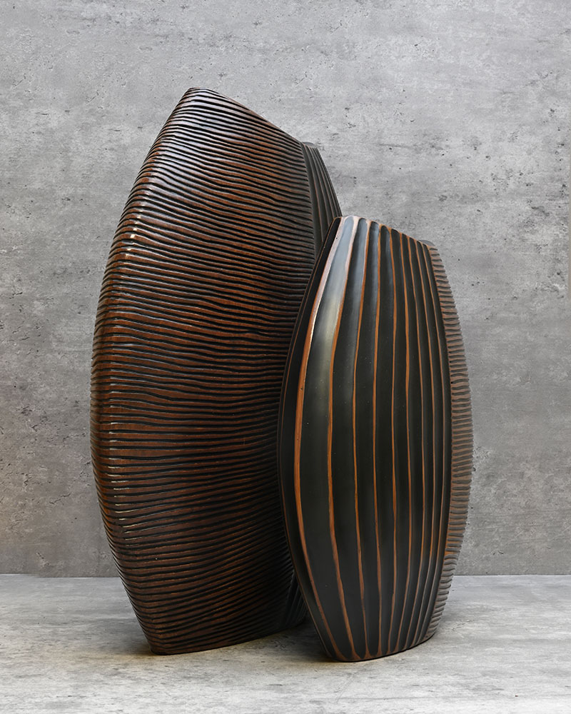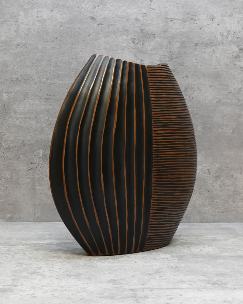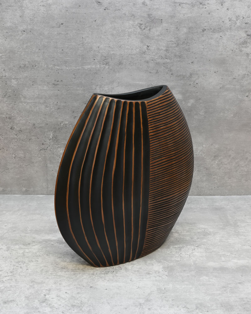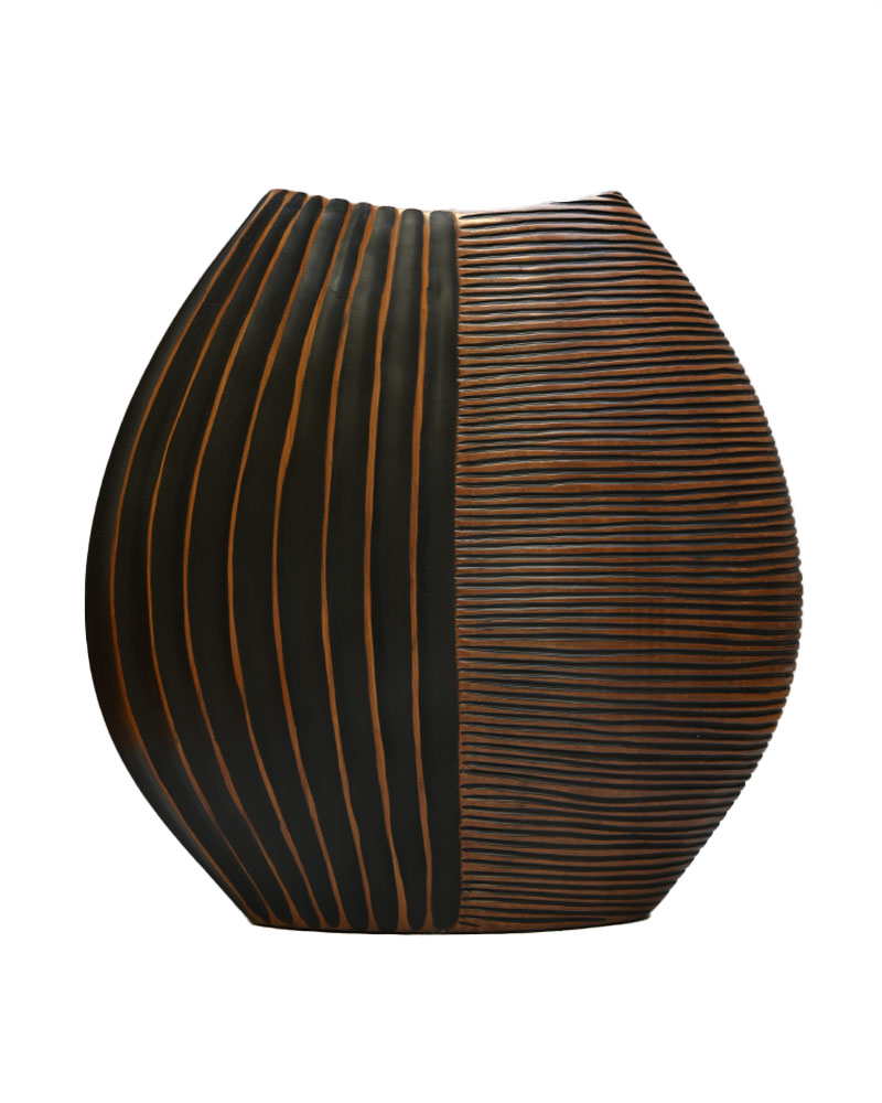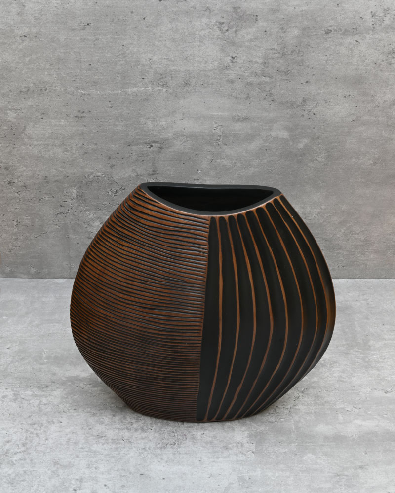 What sets this container apart is its beautifully textured, contoured lines. The rich blend of brown and black tones enhances the etched detailing, creating a bold and distinctive look. Pair it with the right florals, and you have the foundation for a truly stunning arrangement that brings depth, warmth, and character to any space.