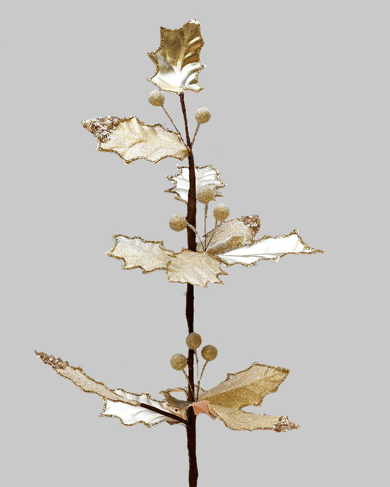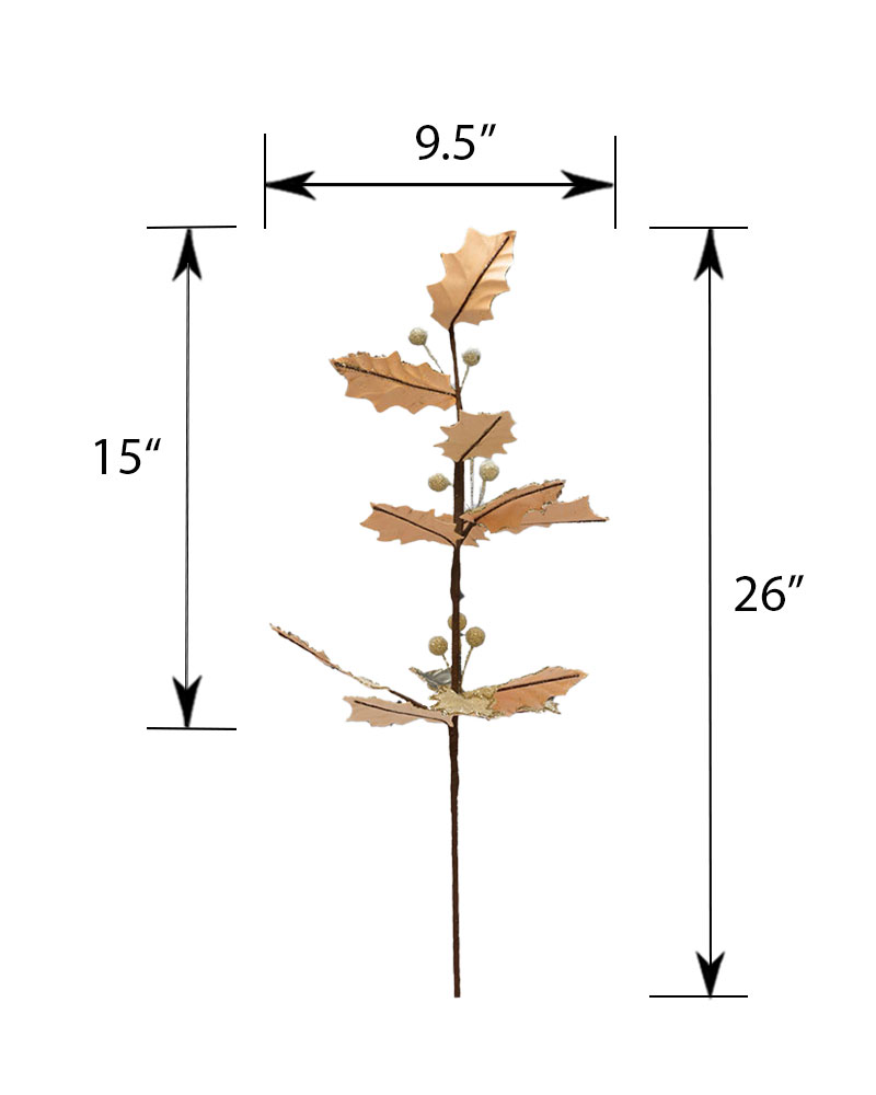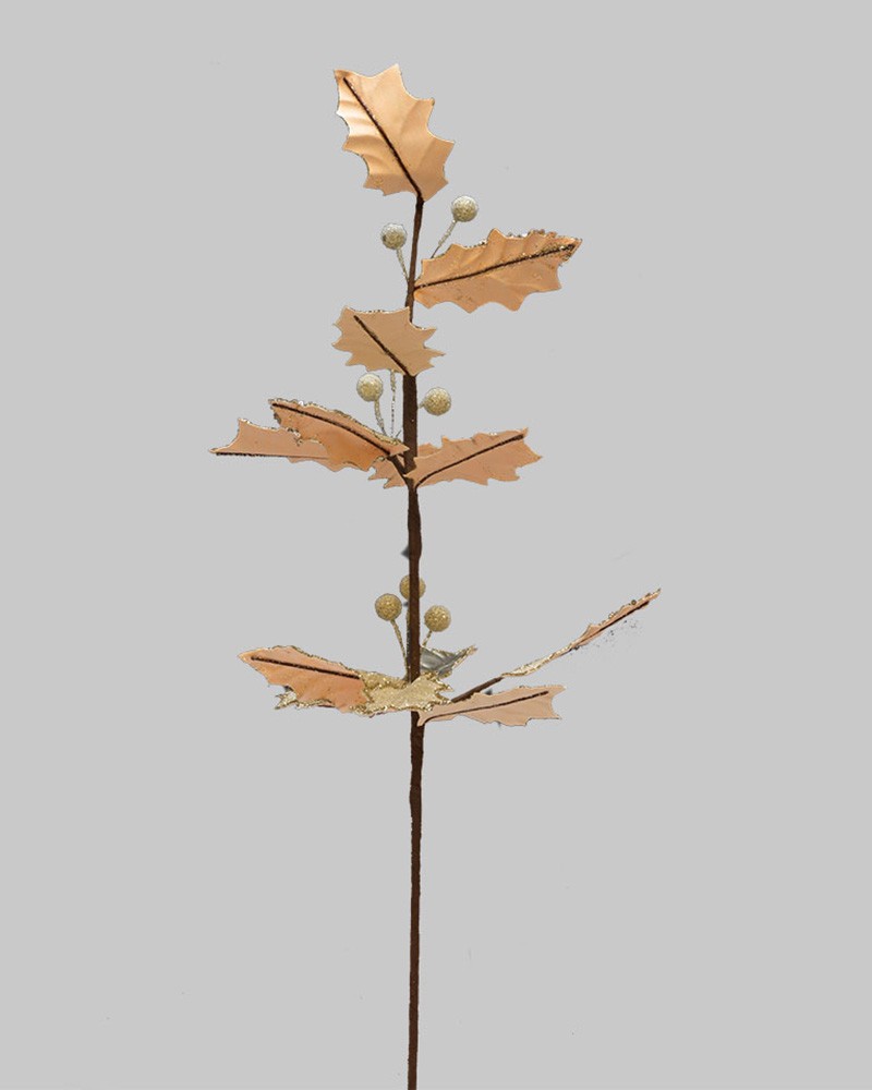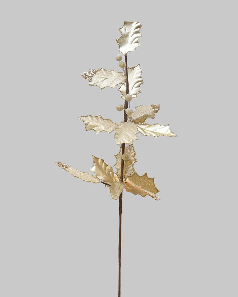 This beautiful holly stem brings a soft, elegant sparkle to your holiday décor. The champagne-toned holly leaves are finished with a gentle metallic sheen and fine glitter detailing, while the matching berries add subtle texture and seasonal charm. Delicately sequinned leaf tips provide an extra hint of festive shimmer. Perfect for centrepieces, wreaths, garlands, or tree accents, this stem offers a refined, upscale look that blends beautifully with both neutral and metallic holiday palettes.