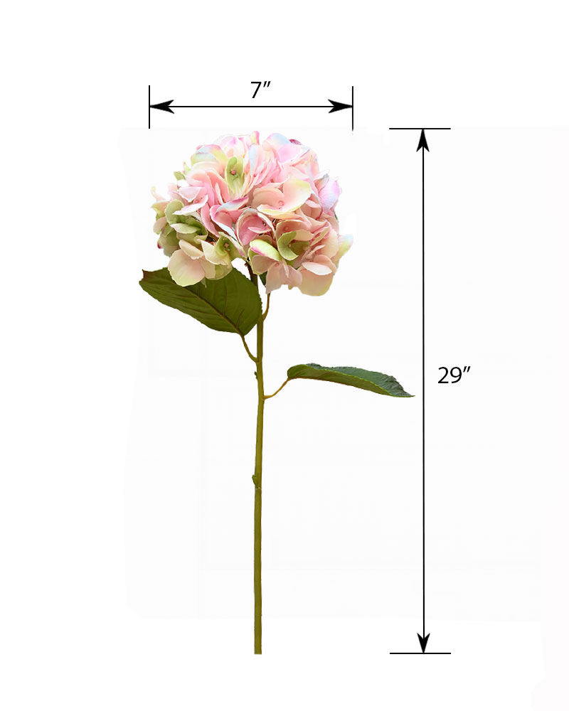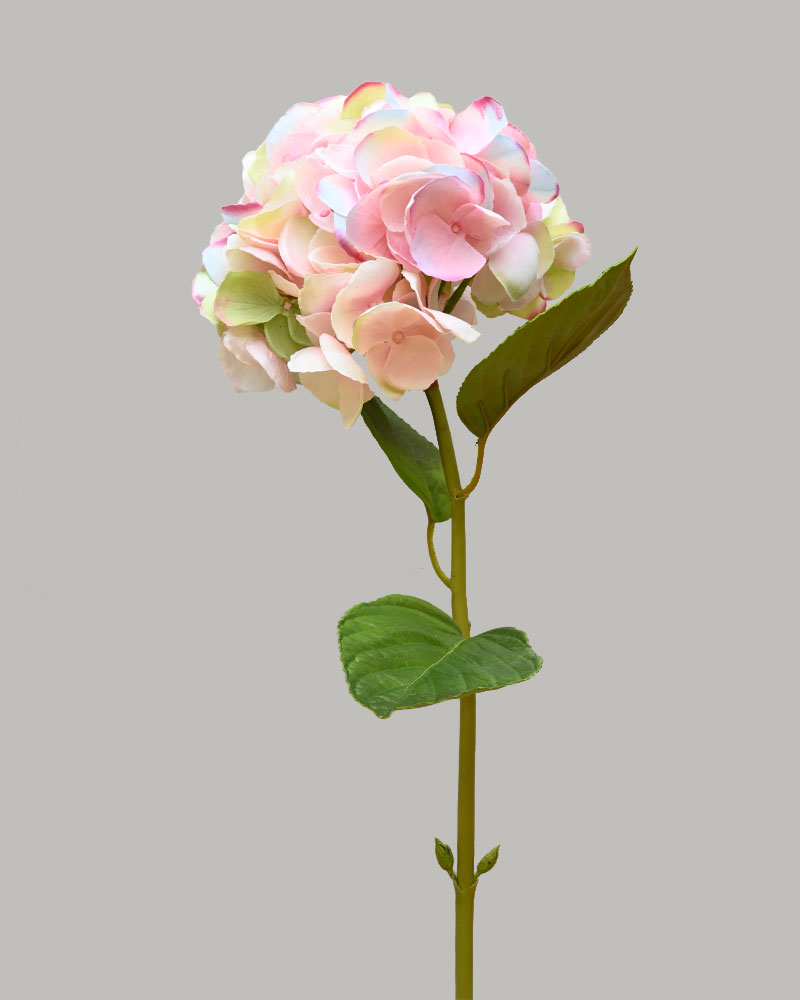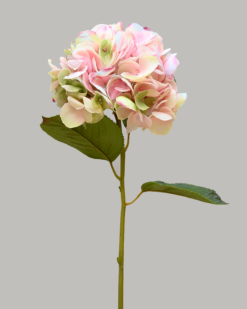 This artificial hydrangea stem showcases a large, lush bloom in soft pink and green shades, adding a gentle yet striking pop of colour. Crafted with a natural touch, it brings lifelike beauty and elegance to any floral arrangement. Ideal for use alone or paired with complementary flowers, it effortlessly enhances your décor with timeless charm.