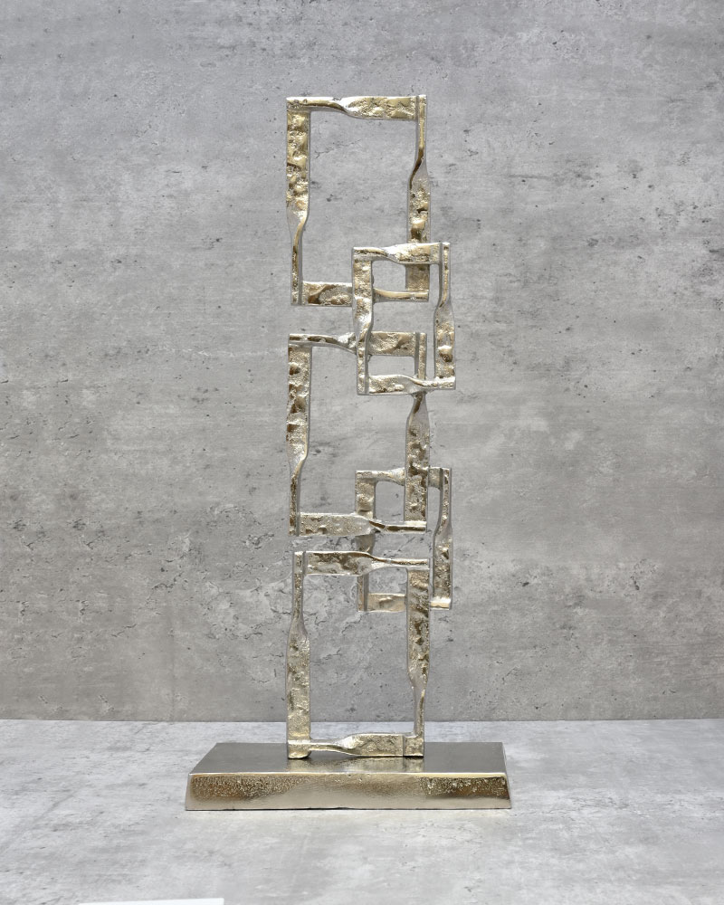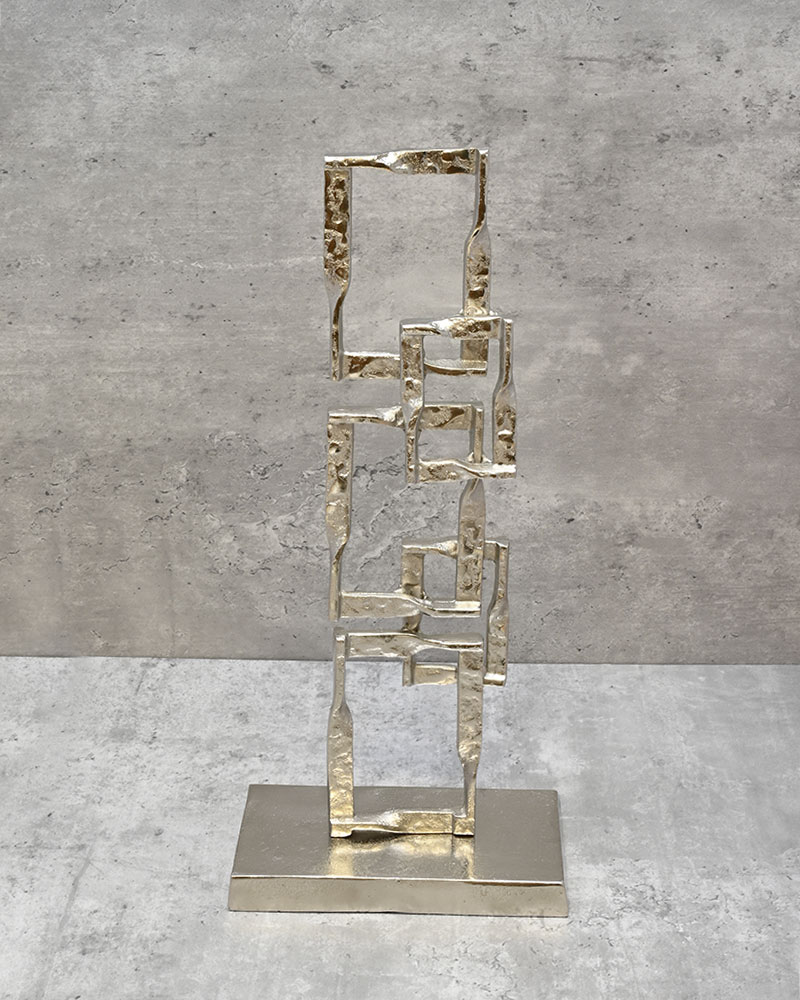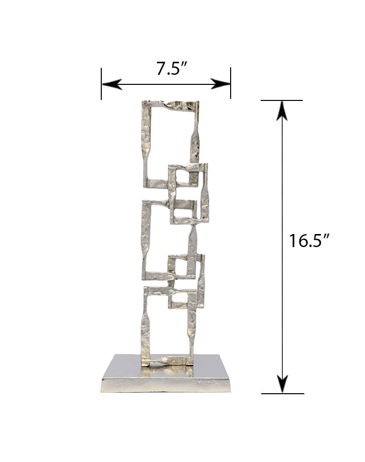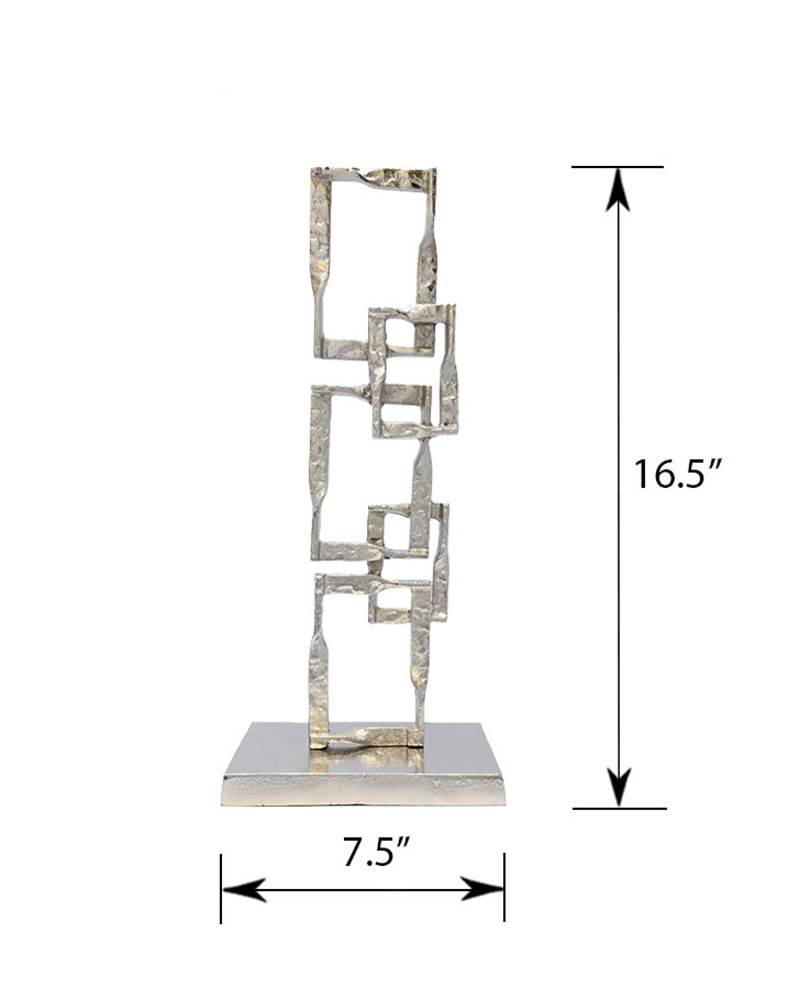 Unique in both shape and style, this stacked square link sculpture features interlocking geometric forms that create a dynamic sense of movement and depth. Its vertical design adds elegant height, making it an eye-catching accent piece perfect for enhancing the aesthetic of any room—whether placed on a shelf, mantle, or console table. Crafted with a sleek finish, this sculpture effortlessly blends modern sophistication with artistic flair.