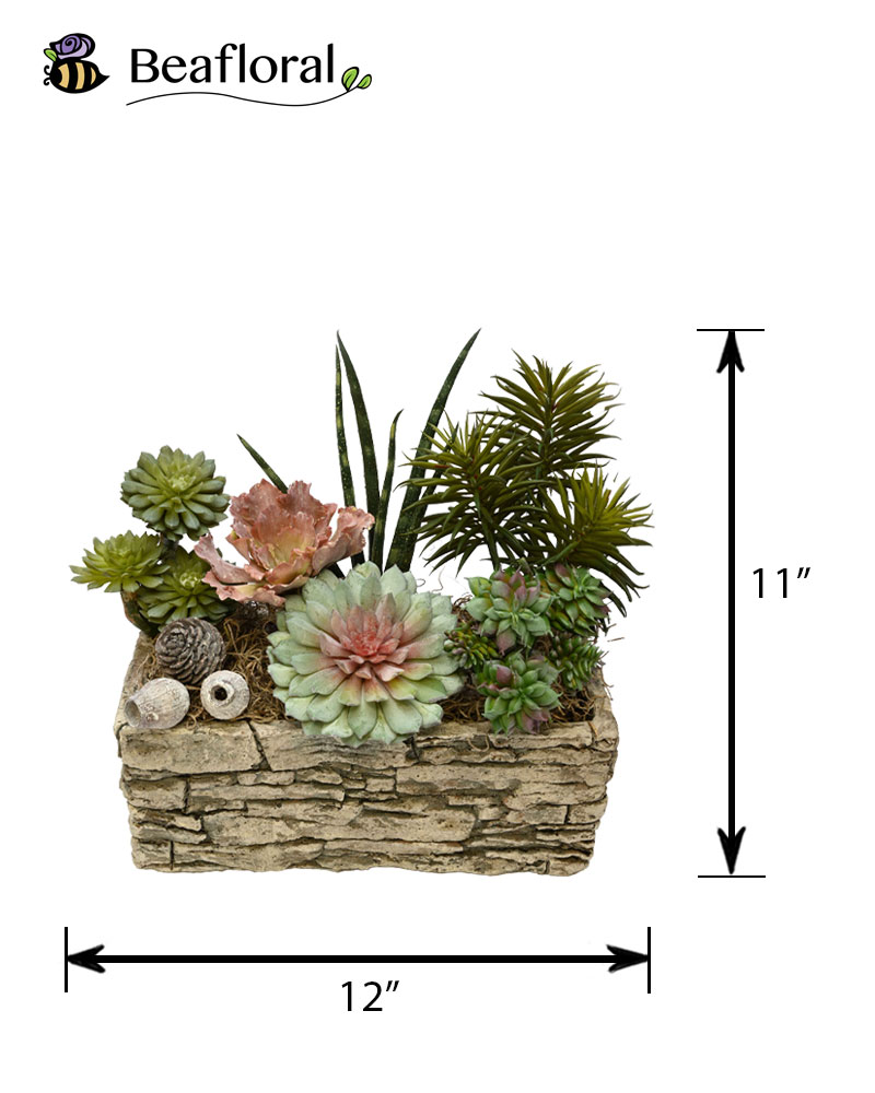 This rich display of succulents is perfectly nestled within a rock-stacked container, blending natural texture with organic beauty. A variety of succulent types—each with unique shapes, tones, and textures—come together in a harmonious mix of greens, purples, and silvery hues. The result is a striking and low-maintenance arrangement that highlights the natural charm and diversity of these fascinating plants.