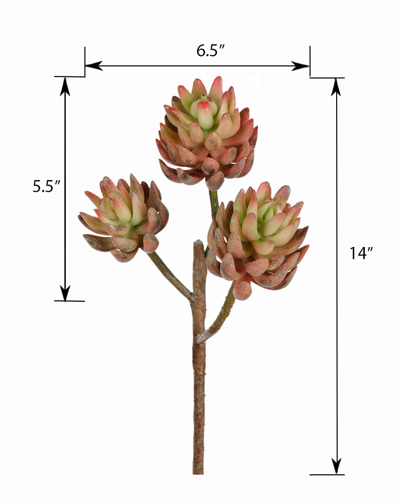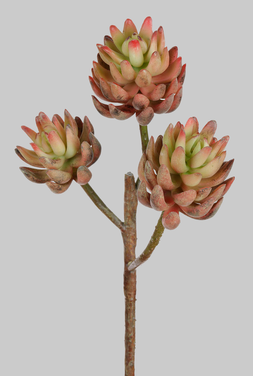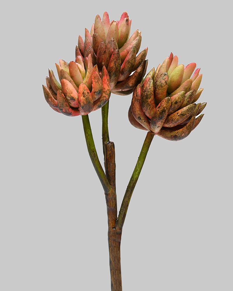 This stem is the perfect succulent accent. Featuring three rosette-shaped heads in beautiful shades of burgundy and green, all atop a multi-branched base, it adds depth, texture, and rich colour to any succulent arrangement. The natural blend of tones and realistic detailing make it an ideal filler or focal piece to bring balance and visual interest to your display.