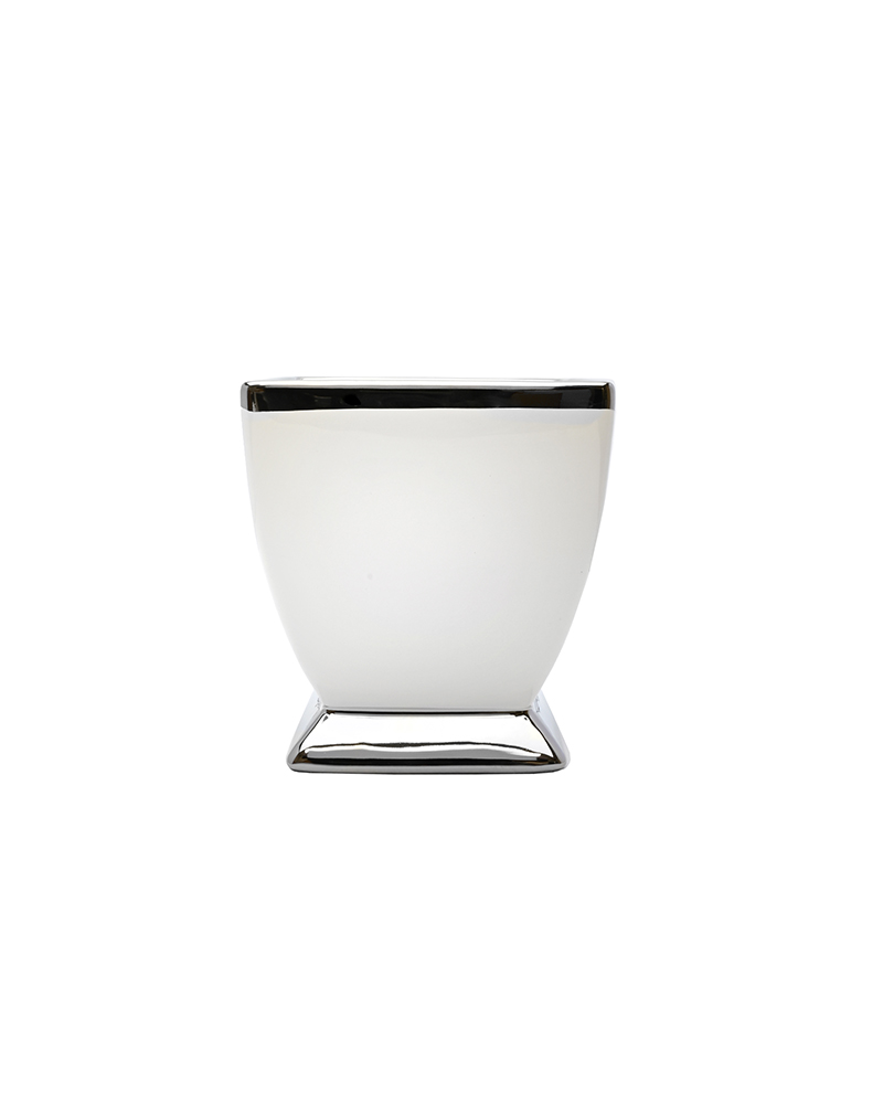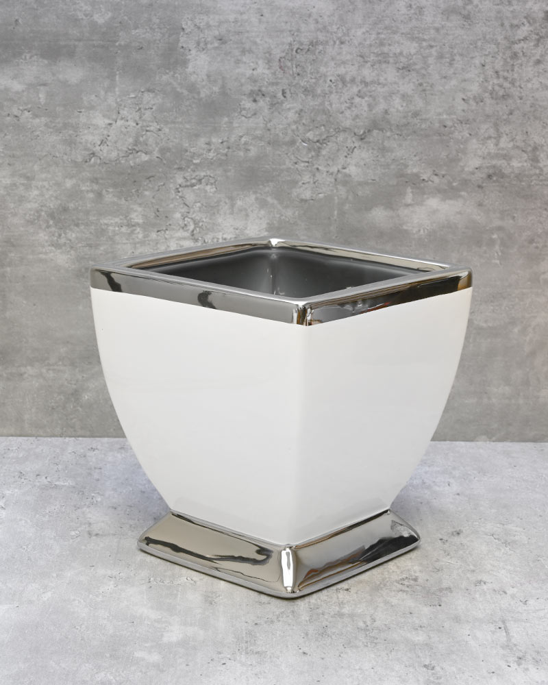 A modern square shape with a ceramic gloss white exterior and a shiny metallic interior combines to create a sleek, versatile container. Its clean lines and contrasting finishes make it ideal for adding a contemporary touch to any space.