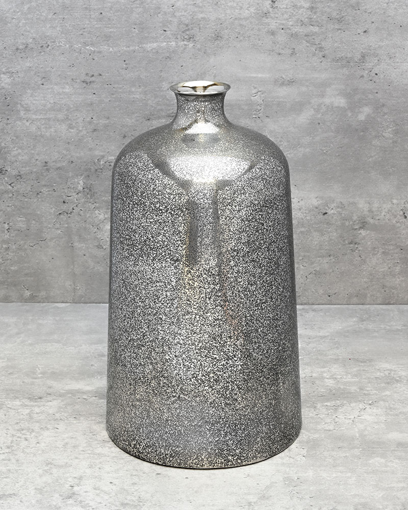 Unique in both shape and finish, this vase is truly a standout piece. Featuring a silver base accented with a distressed, etched black overlay, it offers a striking blend of elegance and character. Whether you're aiming for an antique-inspired aesthetic or simply want to make a bold statement, this vase rises to the occasion—perfect for adding depth and visual interest to any room.
