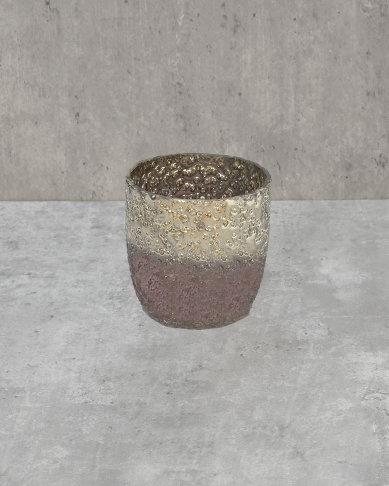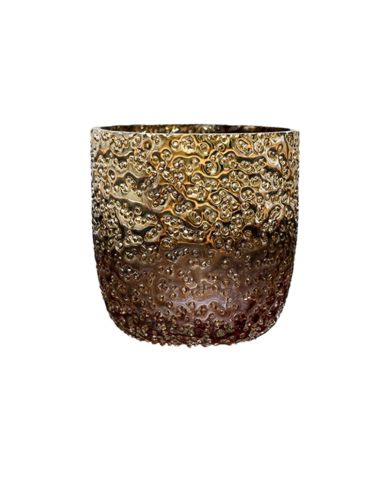 With a pink metallic lustre and a heavily textured finish, this container brings a bold and dramatic touch to any setting. Whether showcased on its own, paired with other sizes in the collection, or filled with a beautiful arrangement, it’s a statement piece that adds elegance and impact to your décor.