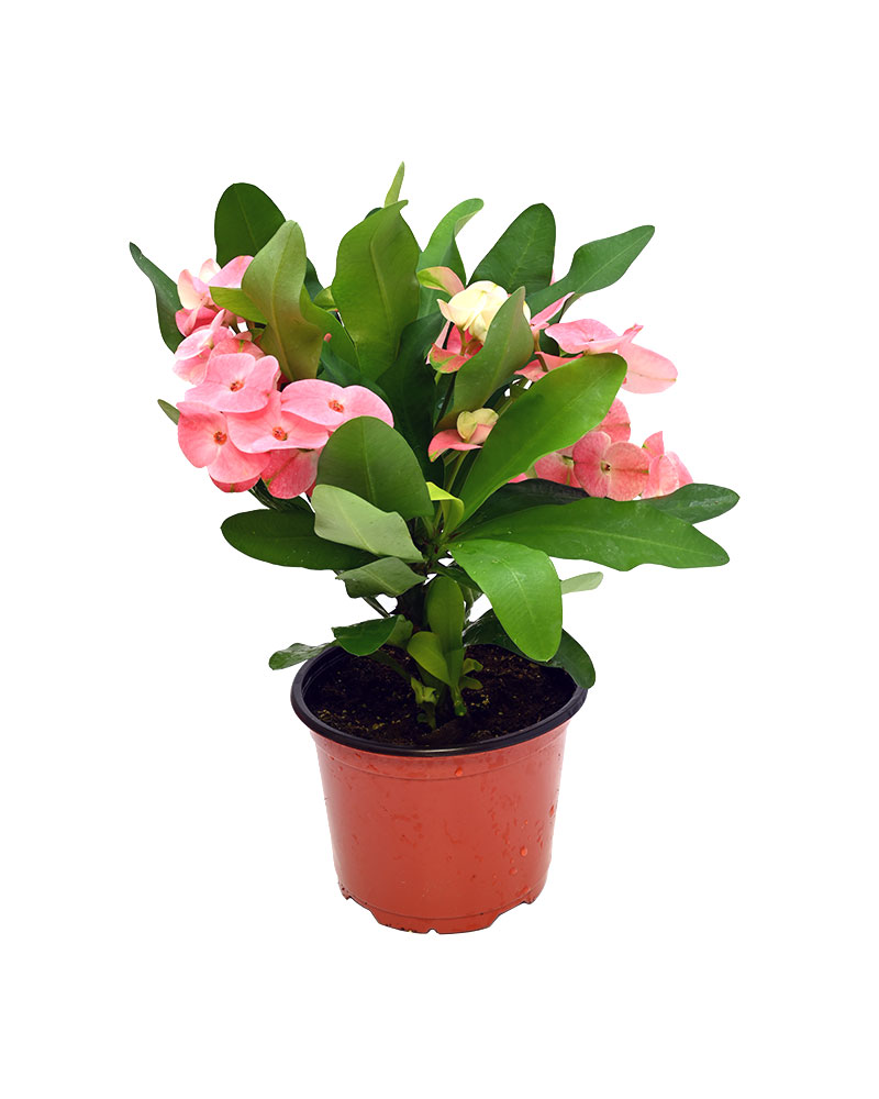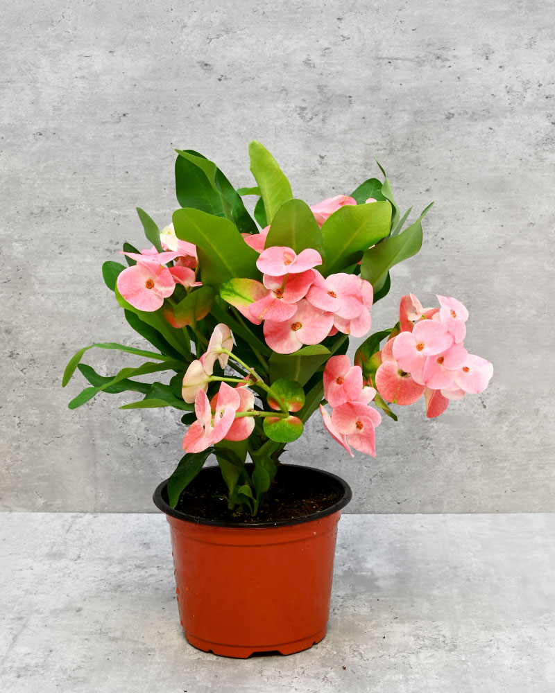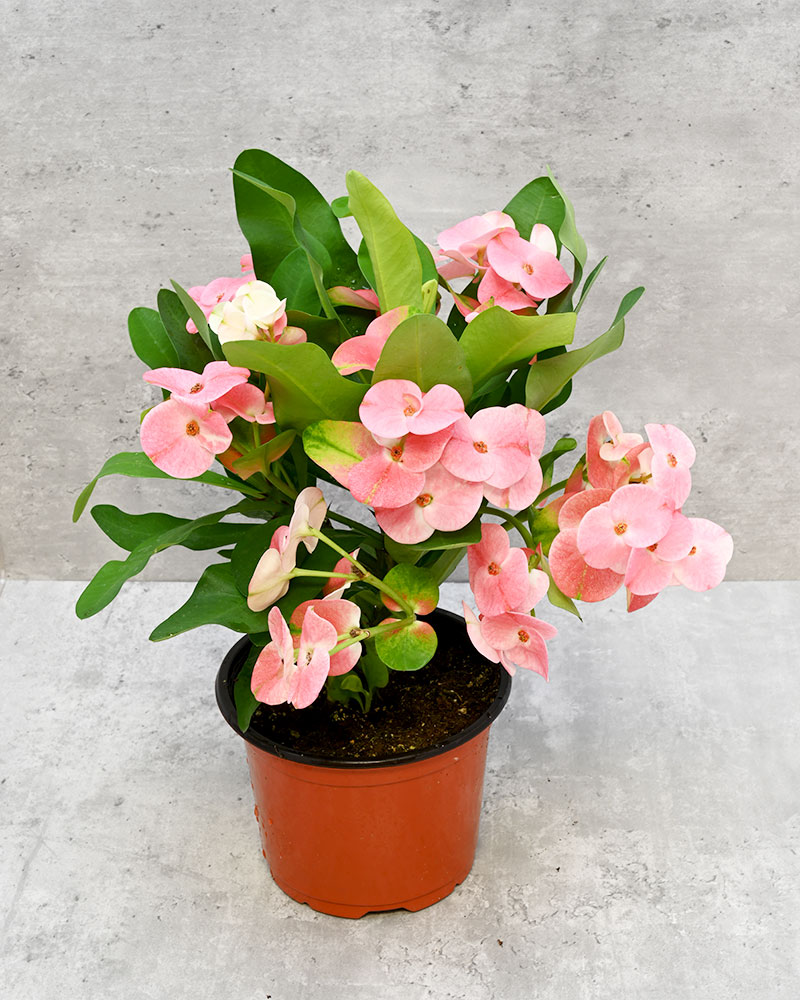 Euphorbia ‘Charlotte’, part of the Tiara Euphorbia series, is a stunning perennial known for its soft pink flower bracts and attractive green foliage. Native to more temperate regions, this upright, mounded plant brings elegant colour and structure to any indoor space or outdoor container during warmer months. Its delicate pink blooms and easy-care nature make it a favourite for both new and experienced plant owners.