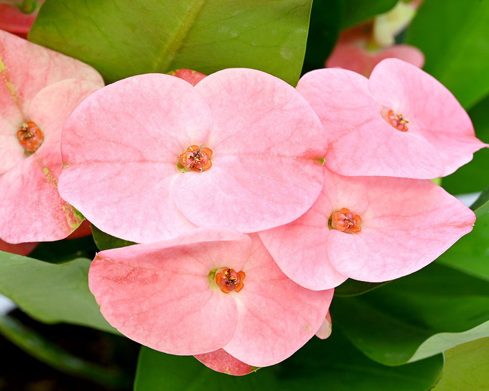 Tiara Euphorbia ‘Charlotte’ blooms in spring and early summer, showcasing beautiful pink bracts that add a soft, cheerful pop of colour. Like other Euphorbias, it produces a milky sap that can irritate the skin and is toxic if ingested—keep out of reach of pets and children.