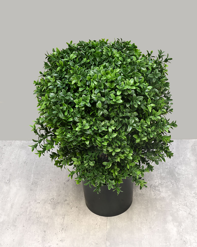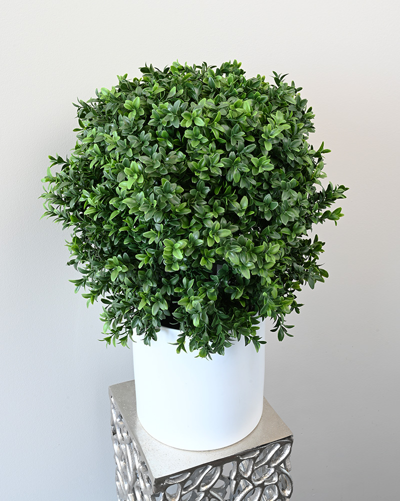 The boxwood is a timeless favourite, known for its versatility and refined aesthetic. Celebrated for its ability to be shaped into endless forms, it's no wonder this classic shrub remains a décor staple. This particular piece features a perfectly sculpted spherical shape — simple, elegant, and ideal for adding a touch of greenery to any home or office, without the maintenance.