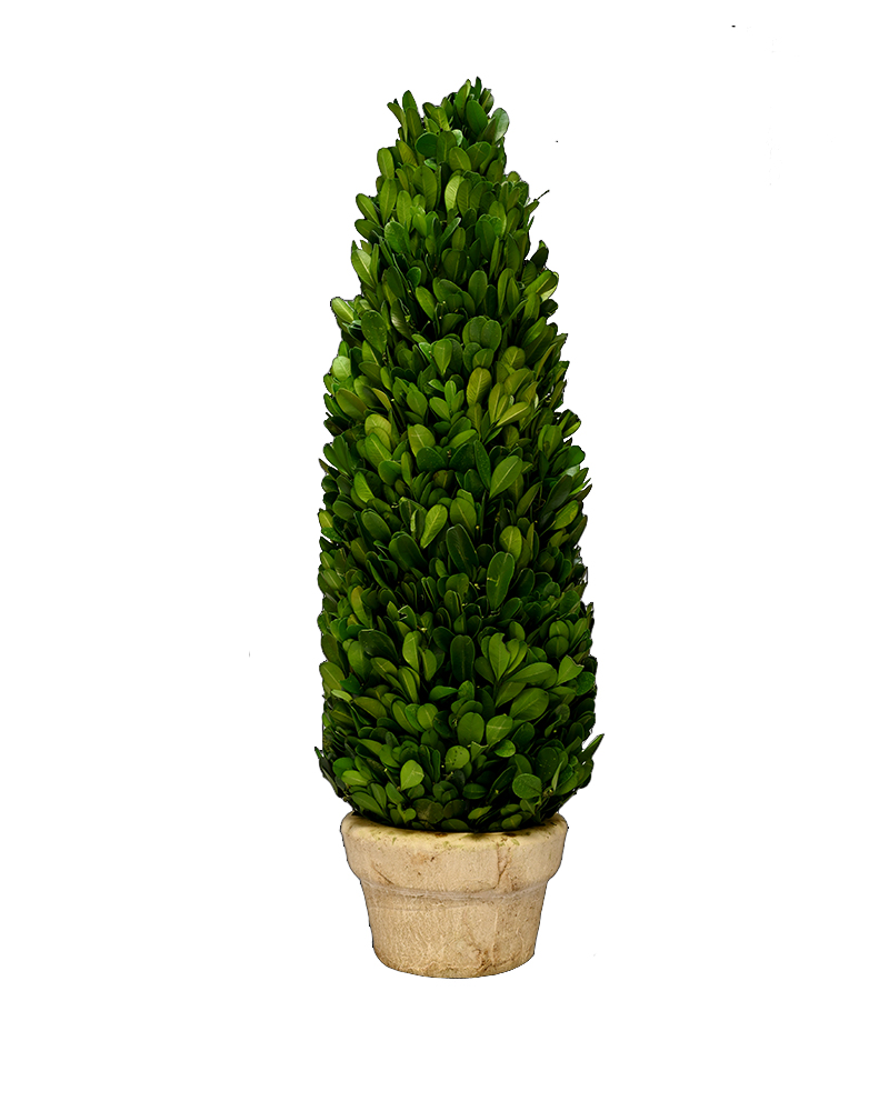 This mini cone-shaped topiary is crafted from real preserved boxwood leaves, expertly formed into a striking and compact tree. It’s a beautiful, long-lasting accent that adds a touch of natural charm to any space.
