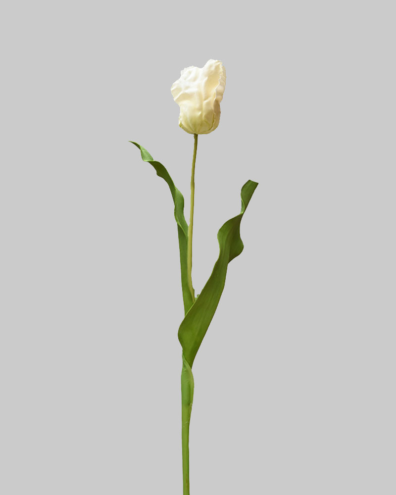 Few flowers are more symbolic of spring than tulips! With stunning blooms atop long green stems, they remind us of life returning to the garden after a long winter’s rest. Whether arranged alone or mixed with other spring favourites, these tulips add a splash of colour that brings spring indoors. This Parrot Tulip bud is a unique variety with distinctive frilly petals that add style and texture. Its soft white colouring, combined with a natural touch, creates a subtle yet elegant look for any vase or container.