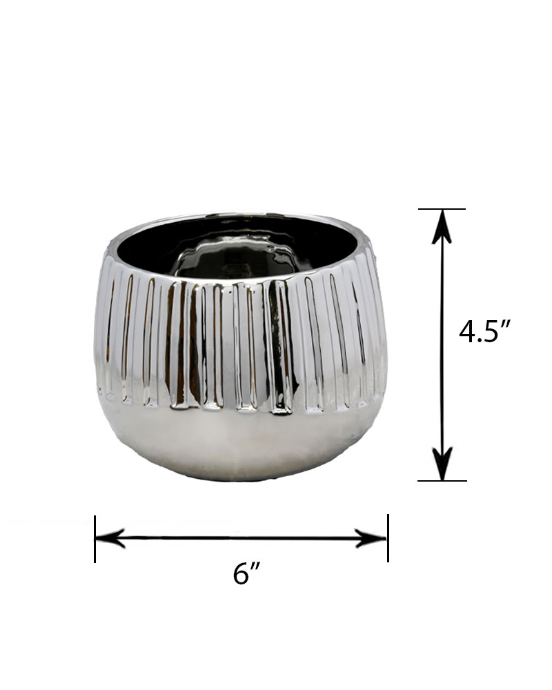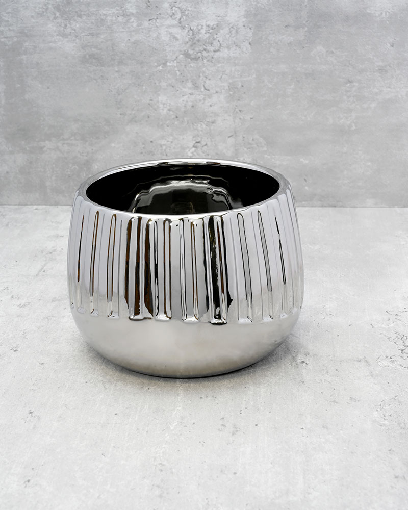 With its polished silver-chrome finish and ribbed textured design, this container brings a sleek, modern touch to any room. Whether used on its own or as part of an arrangement, it adds shine, texture, and contemporary style to any setting.