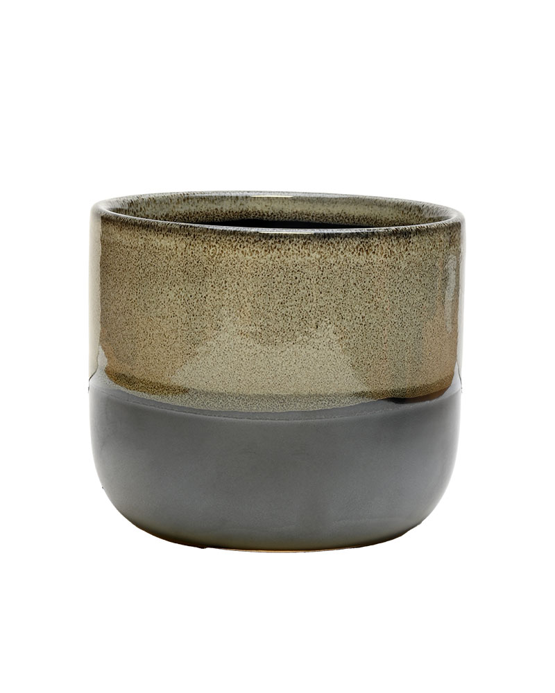 This two-toned container features a blend of grey, brown, and black shades that create a warm, earthy feel. Topped with a glossy finish, it adds the perfect touch of warmth and glow to any arrangement or home décor setting seeking a natural, inviting look.