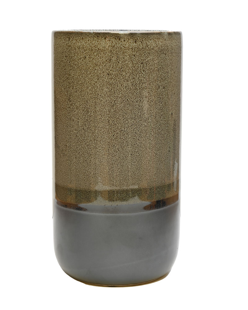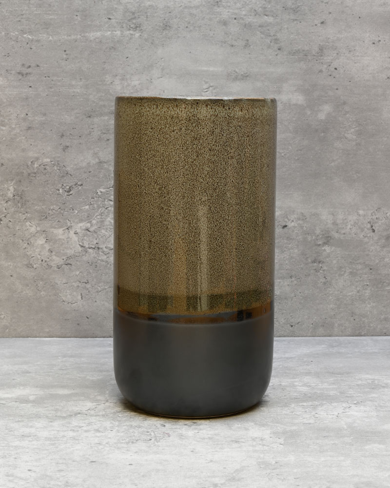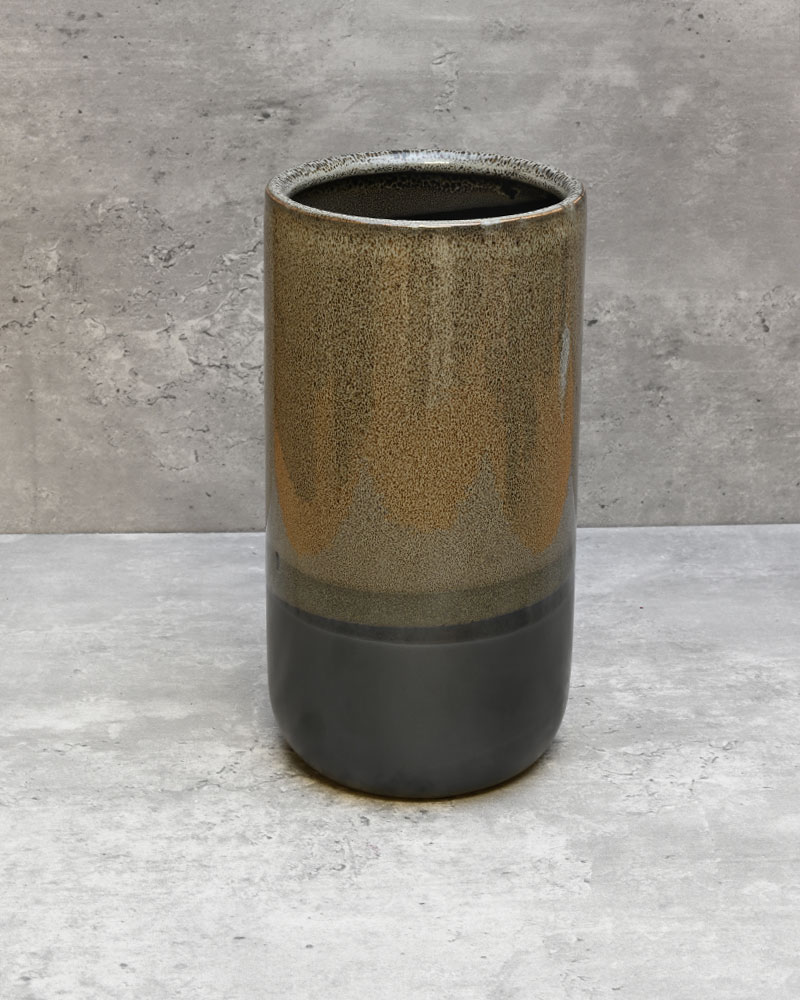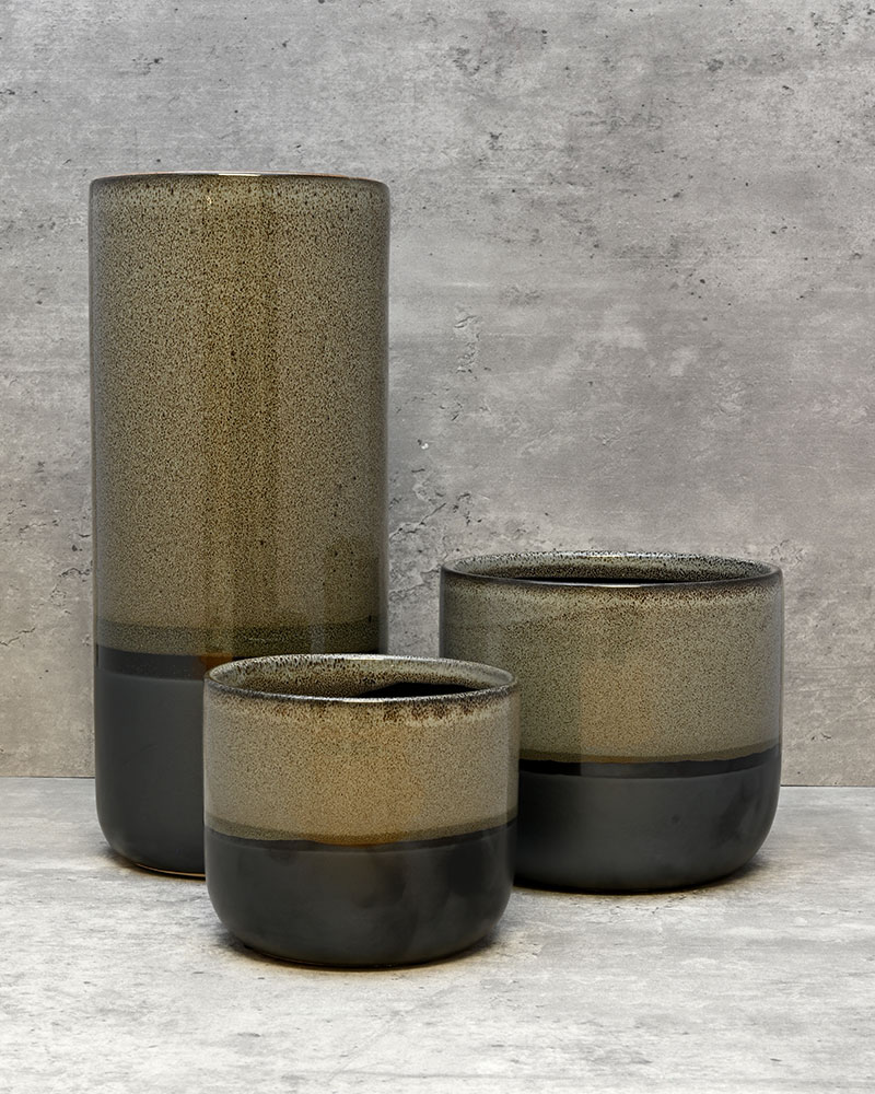 This two-toned container features a blend of grey, brown, and black shades that create a warm, earthy feel. Topped with a glossy finish, it adds the perfect touch of warmth and glow to any arrangement or home décor setting seeking a natural, inviting look.