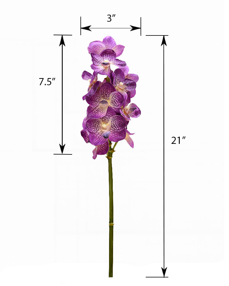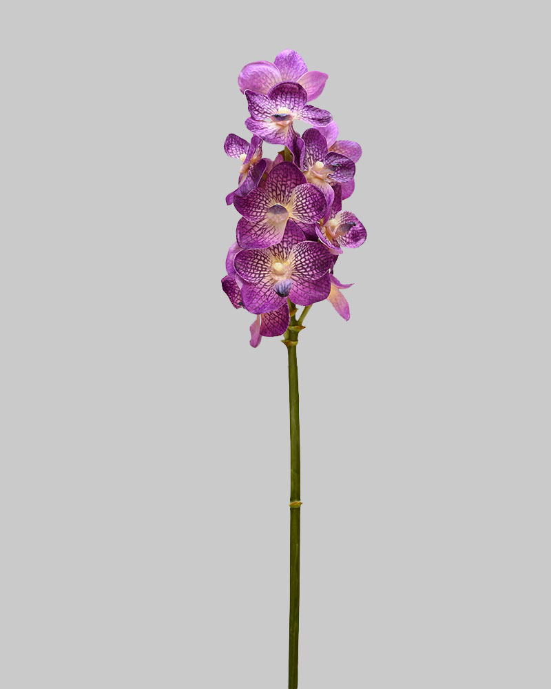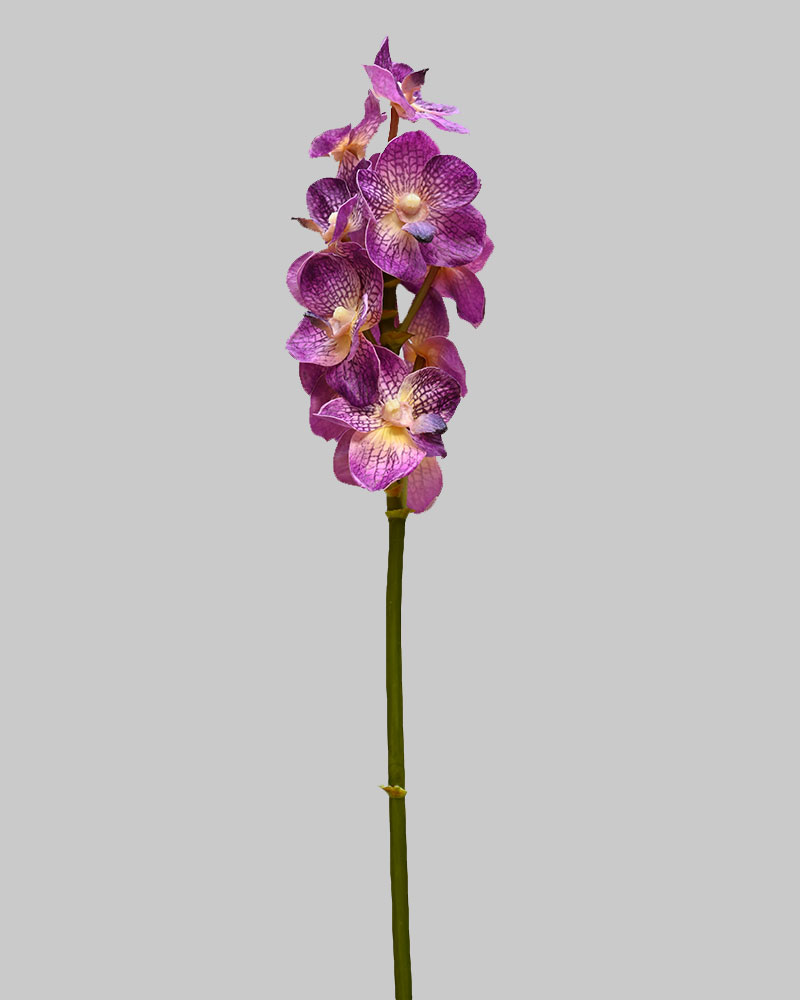 The Vanda Orchid is admired for its long-lasting blooms, vibrant colours, and distinctive, trailing roots. This artificial stem has been meticulously crafted with exceptional attention to detail, creating a strikingly realistic and dramatic visual display. The deep purple flowers add a rich, elegant touch, making it a captivating focal point in any setting. Orchids never disappoint—making them the perfect addition to any container or arrangement.