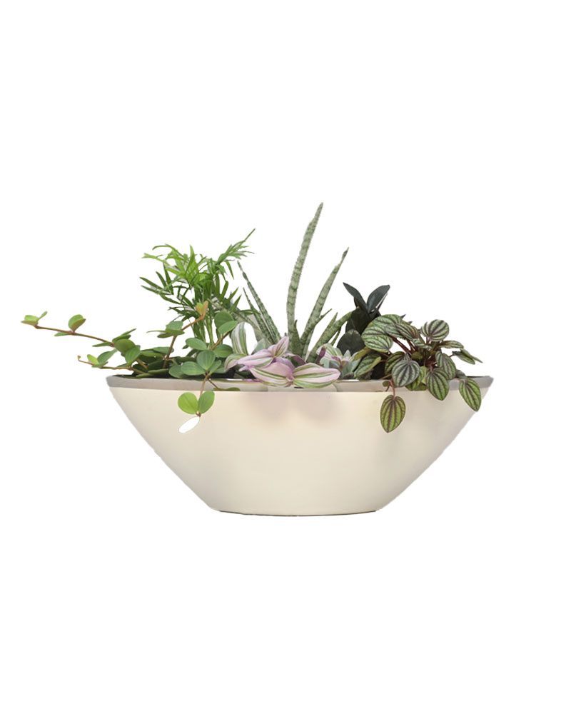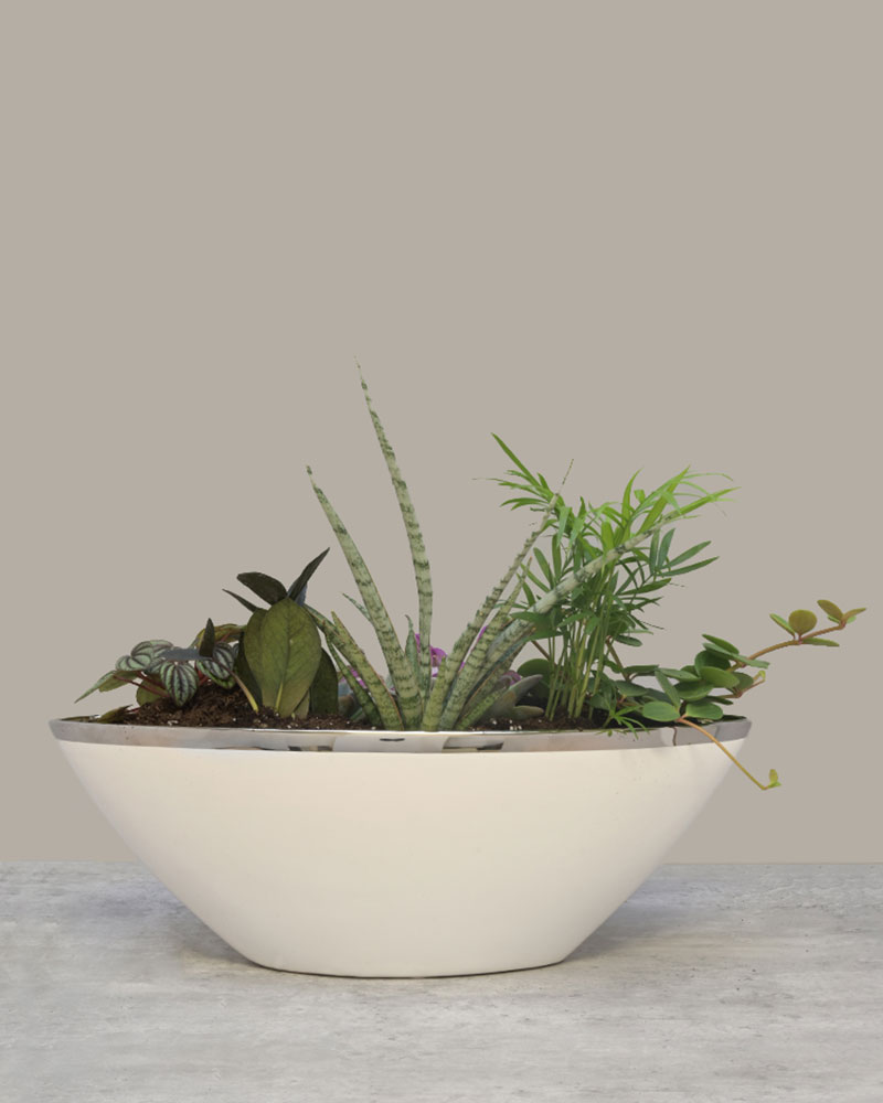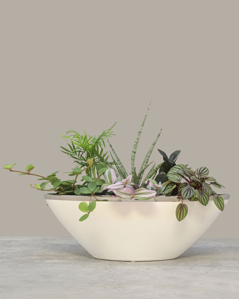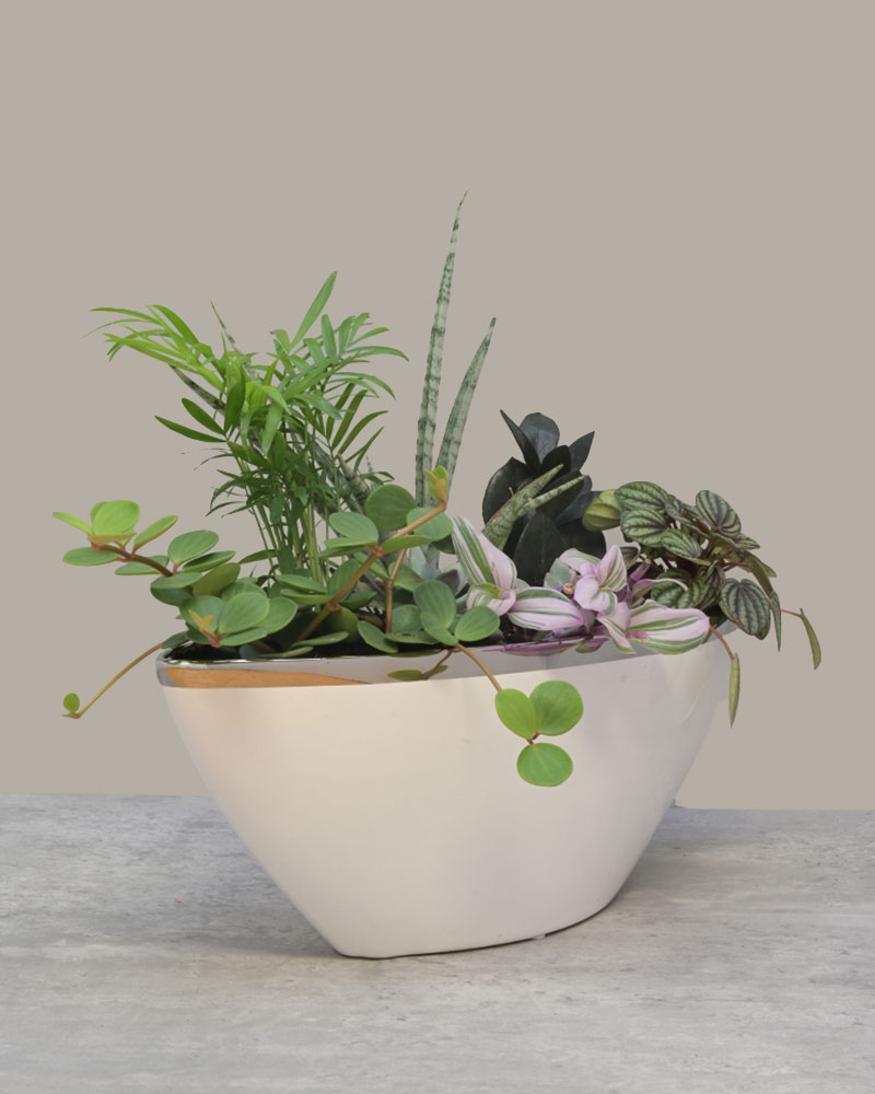 Graceful, lush, and full of life, Verdant Balance blends modern design with natural serenity. A curated mix of tropical foliage and succulents - from striped pink tradescantia to sculptural sansevieria and glossy peperomia - come together in a sleek, curved white ceramic planter. The result is a living composition that feels both airy and grounded, bringing harmony and texture to any space. Perfect for coffee tables, reception areas, or bright interiors, this arrangement adds a touch of effortless elegance to any setting.