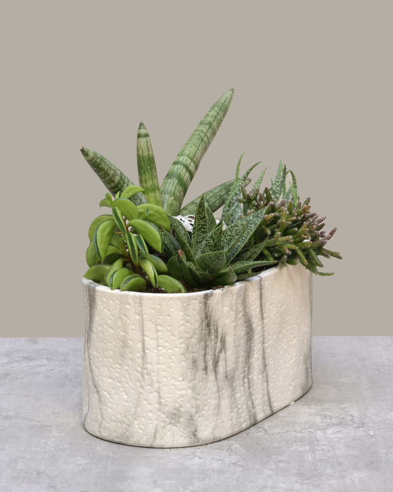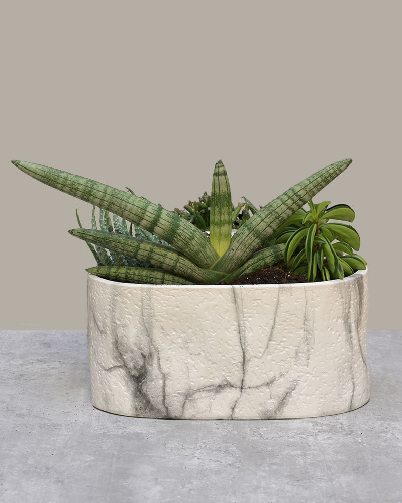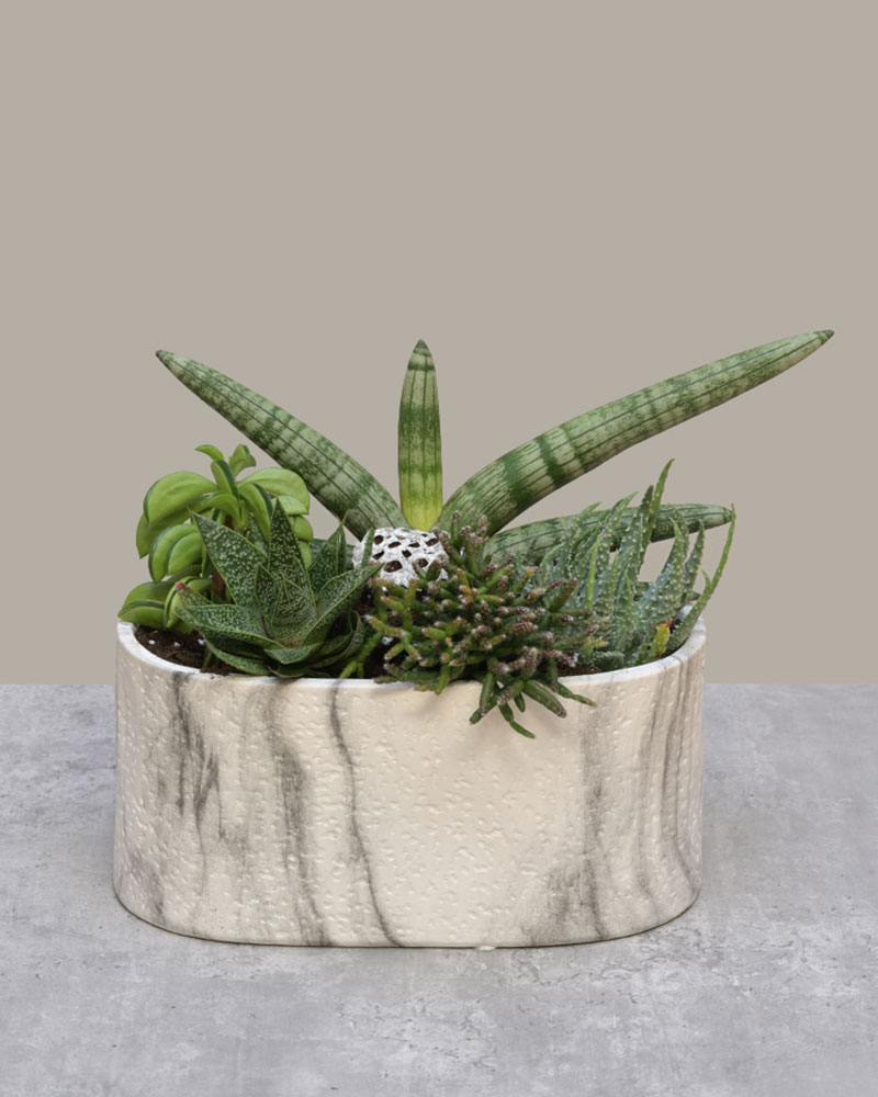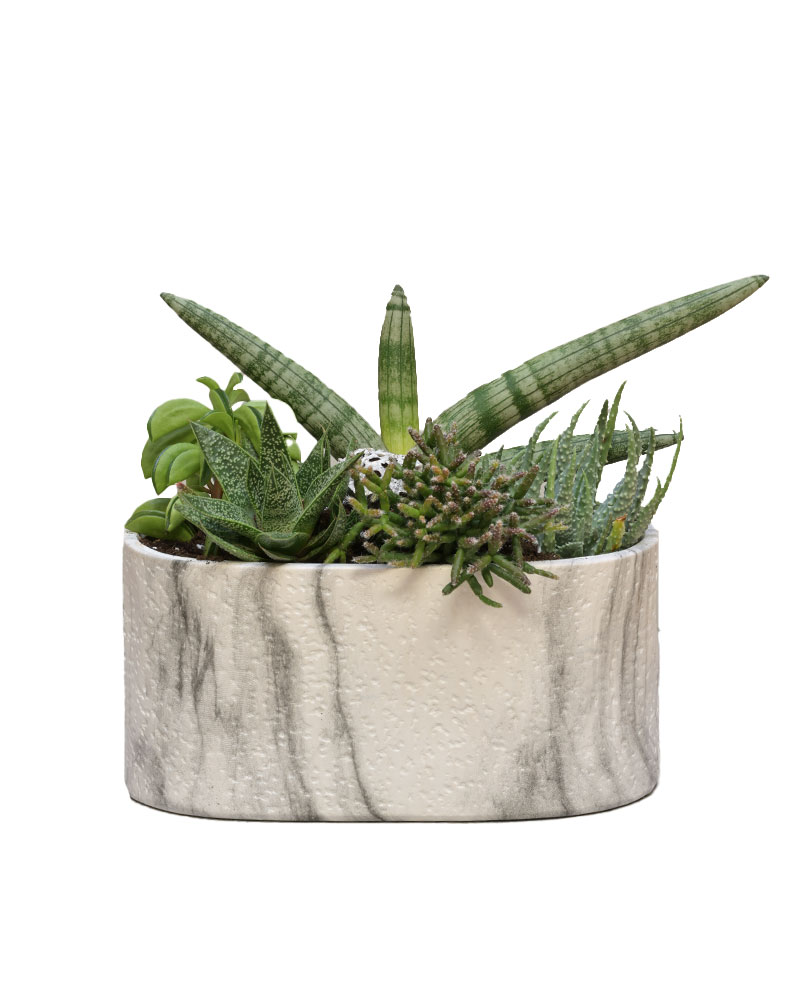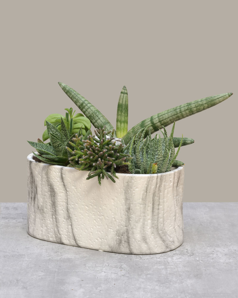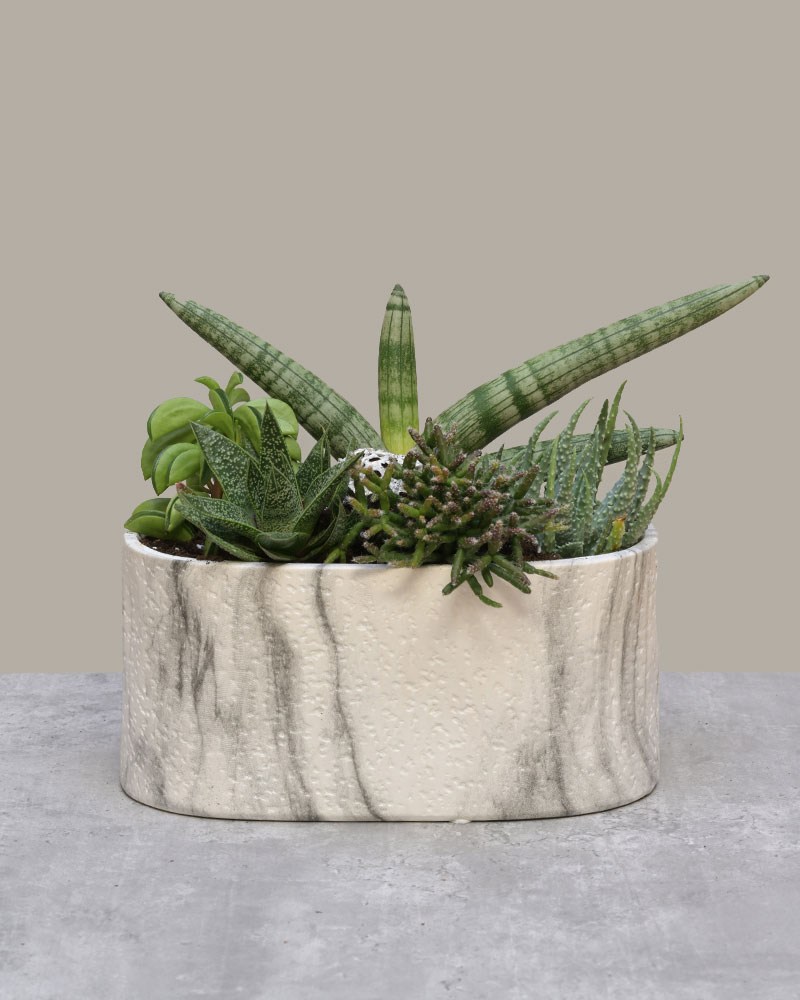 Soft, sculptural, and quietly striking — Whispering Greens celebrates the beauty of balance and texture. Tall sansevieria spears rise gracefully from a marble-textured ceramic planter, surrounded by compact succulents in layered shades of green. The result is a modern, desert-inspired arrangement that feels both bold and calming — a perfect statement of natural elegance.