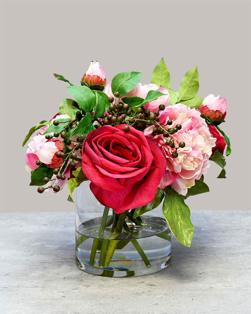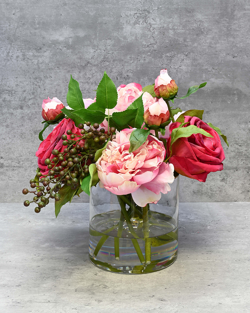Peonies and roses fill this vase, blending vibrant colour and timeless style to create a classic arrangement. Added greenery provides a beautiful contrast, enhancing the natural look. The stems are artfully placed within the glass vase in faux water, giving the illusion they were just clipped from the garden. Perfect for any table in the home, this arrangement brings a fresh, natural look to your space.