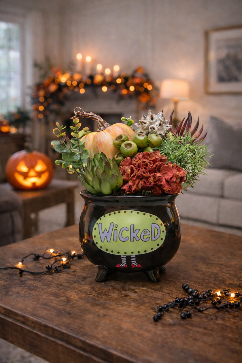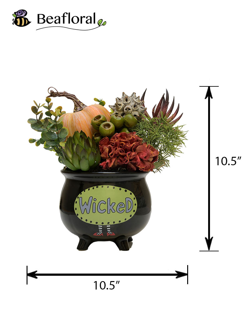 This playful artificial arrangement is brimming with Halloween spirit, displayed in a whimsical black cauldron marked with a bright "Wicked" sign and striped witch legs. Tucked inside are festive seasonal accents, including a miniature pumpkin, vibrant greenery, spiky textures, and bold pops of fiery orange blooms. The mix of natural harvest elements with quirky Halloween flair makes this piece a fun and eye-catching addition to your fall décor. Perfect for tabletops, entryways, or party displays, it brings just the right blend of autumn charm and spooky fun.