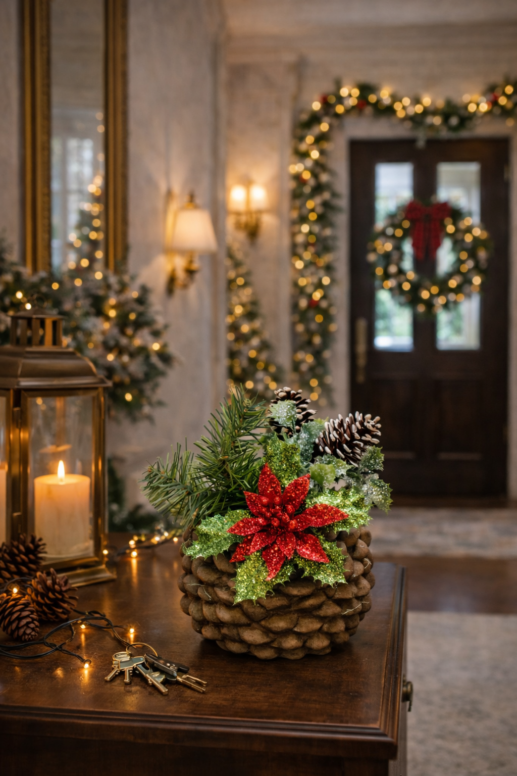A classic Christmas arrangement nestled in a charming pinecone-inspired container. At its heart, a prominent sparkling poinsettia adds festive flair, beautifully complemented by snow-tipped pinecones and a touch of winter greenery. This delightful combination creates the perfect holiday accent for any tabletop, bringing warmth, texture, and seasonal cheer to your home.