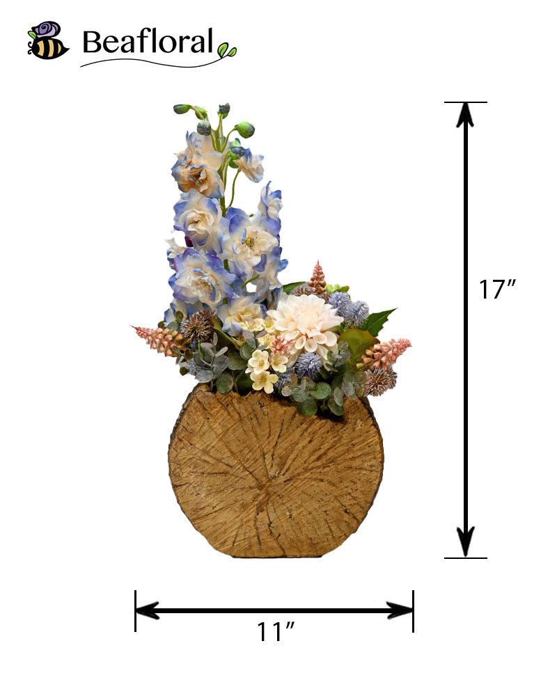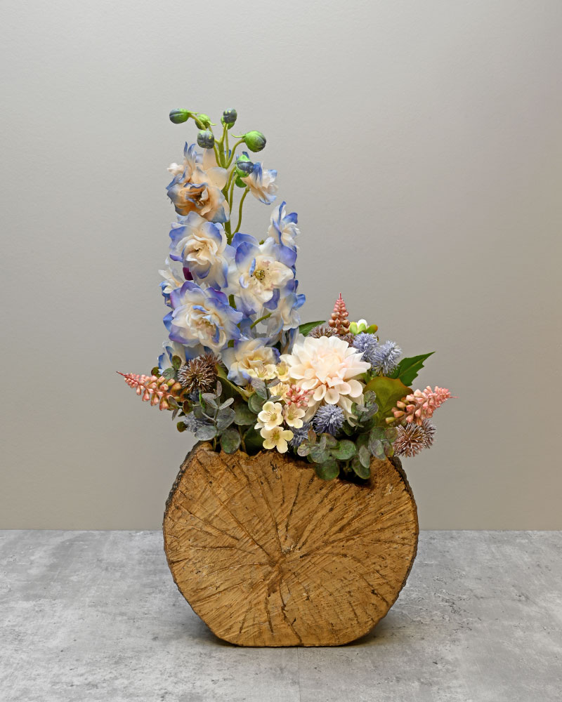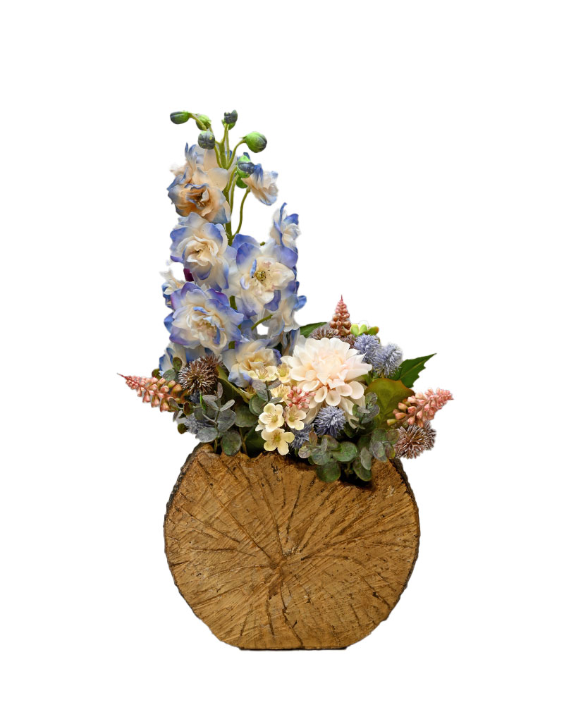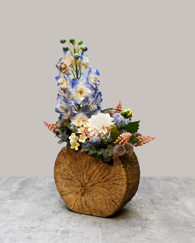 Set in a tree trunk-inspired container, this unique arrangement pairs rustic charm with botanical elegance. The true star of the piece is the incredibly lifelike natural-touch delphinium—so realistic, it not only looks like the real thing but feels like it too. It's beautifully complemented by a subtle yet elegant dahlia, with carefully chosen accent florals and foliage adding texture and balance. Together, these elements create a striking display of colour and style that captures attention and brings a touch of nature indoors with refined flair.